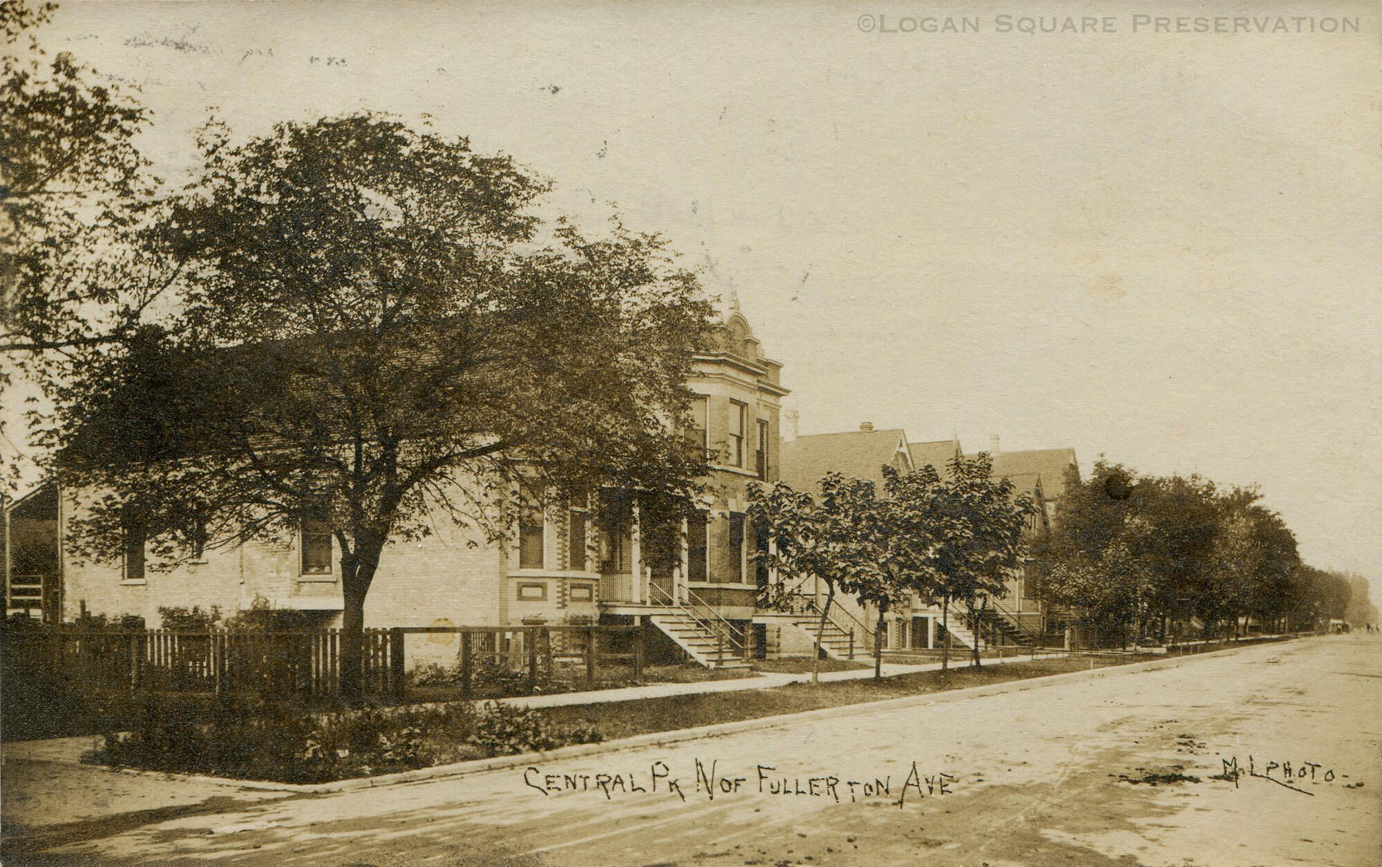 Real-photo postcard view looking northwest at brick and frame workers cottages and brick two-flat on 2400 block of N. Central Park Ave, circa 1907-1908. Duplicate of card #022-3Subject