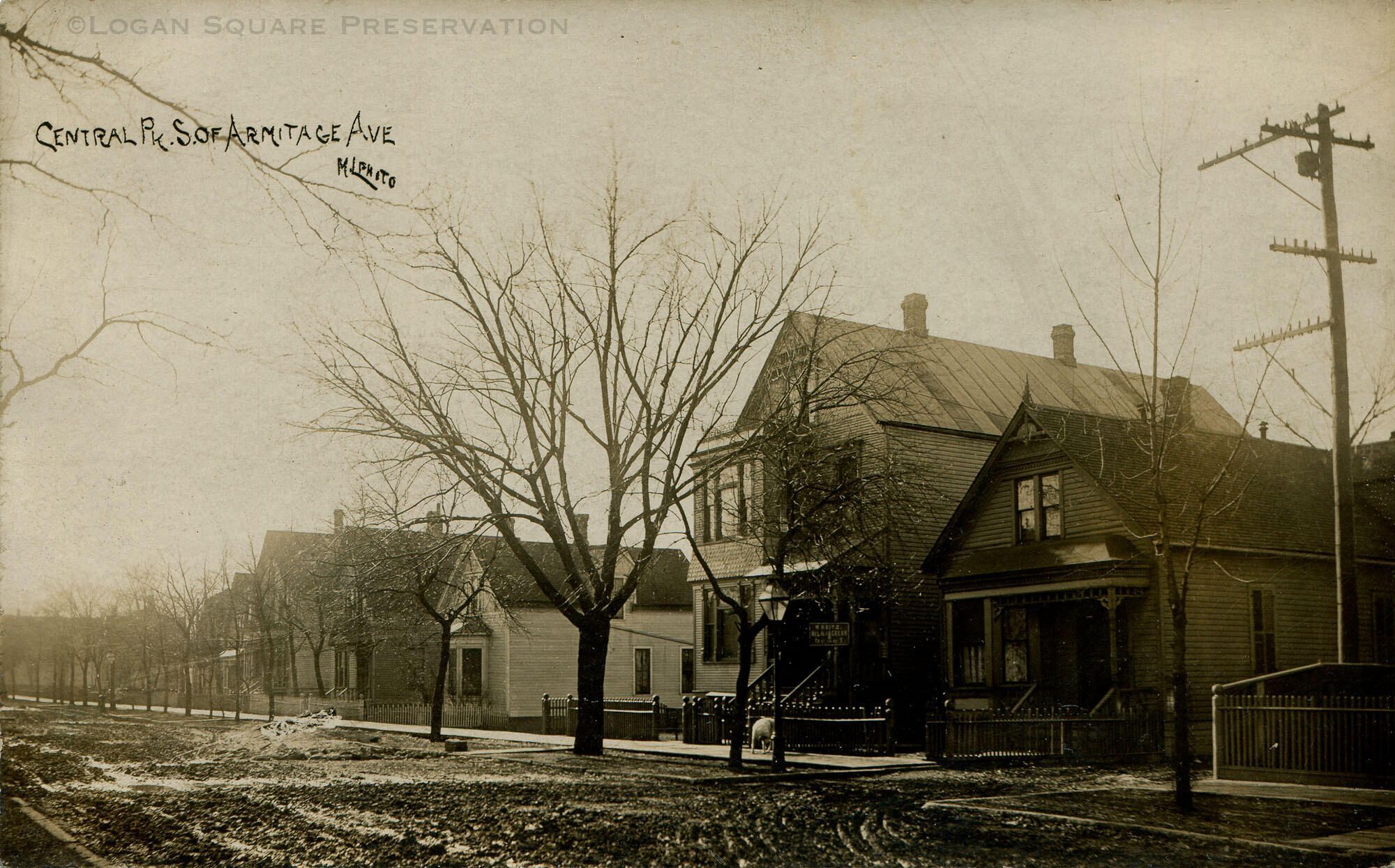 Real-photo postcard view looking southwest at workers cottages and frame 2-flats on muddy 1900 block of N. Central Park Ave, circa 1907-1908Subject
