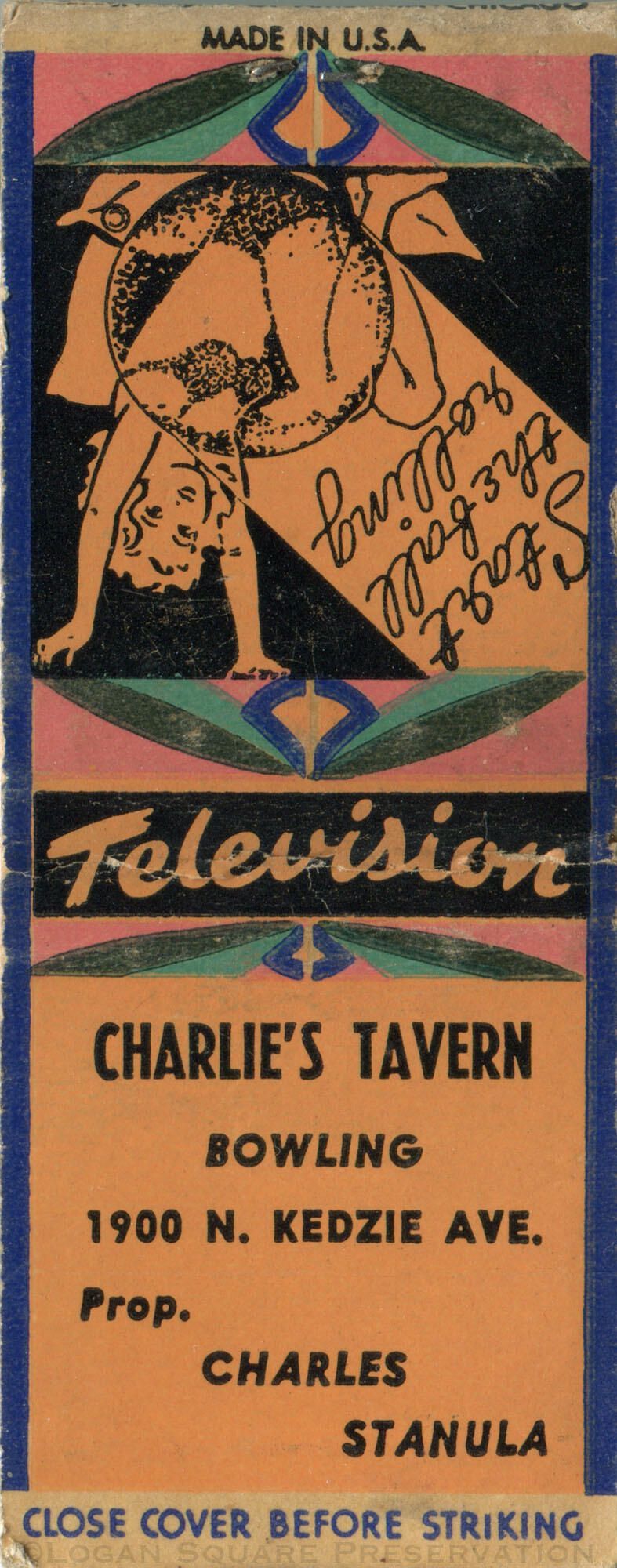 1.5" yellow matchbook with illustration of woman in bikini on back from Charles Stanula tavern with bowling alley. "Start the ball rolling"Publication Details
