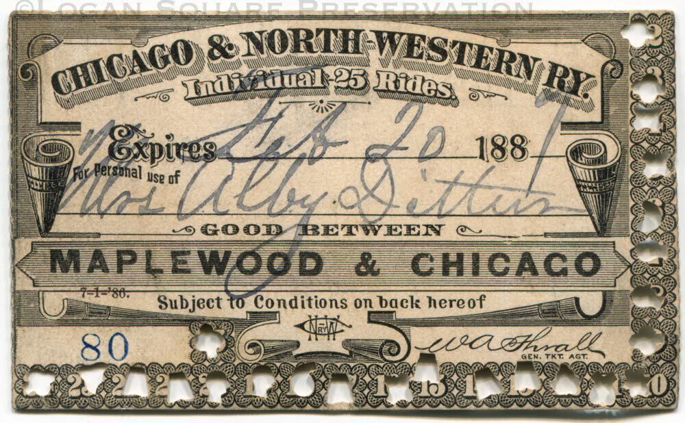 Ticket good for 25 rides between Maplewood station and Chicago terminal issued to Mrs. Alby Dittus, issued Aug 20, 1886Publication Details