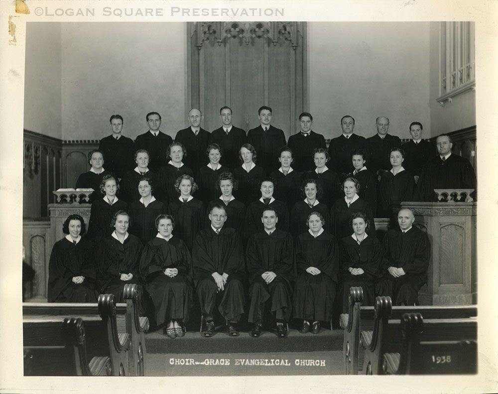 Group portrait of church choir sitting on chairs and standing in chancel of Grace Church with pastor Irvin Schweitzer at pulpit, 1938Photograph Details