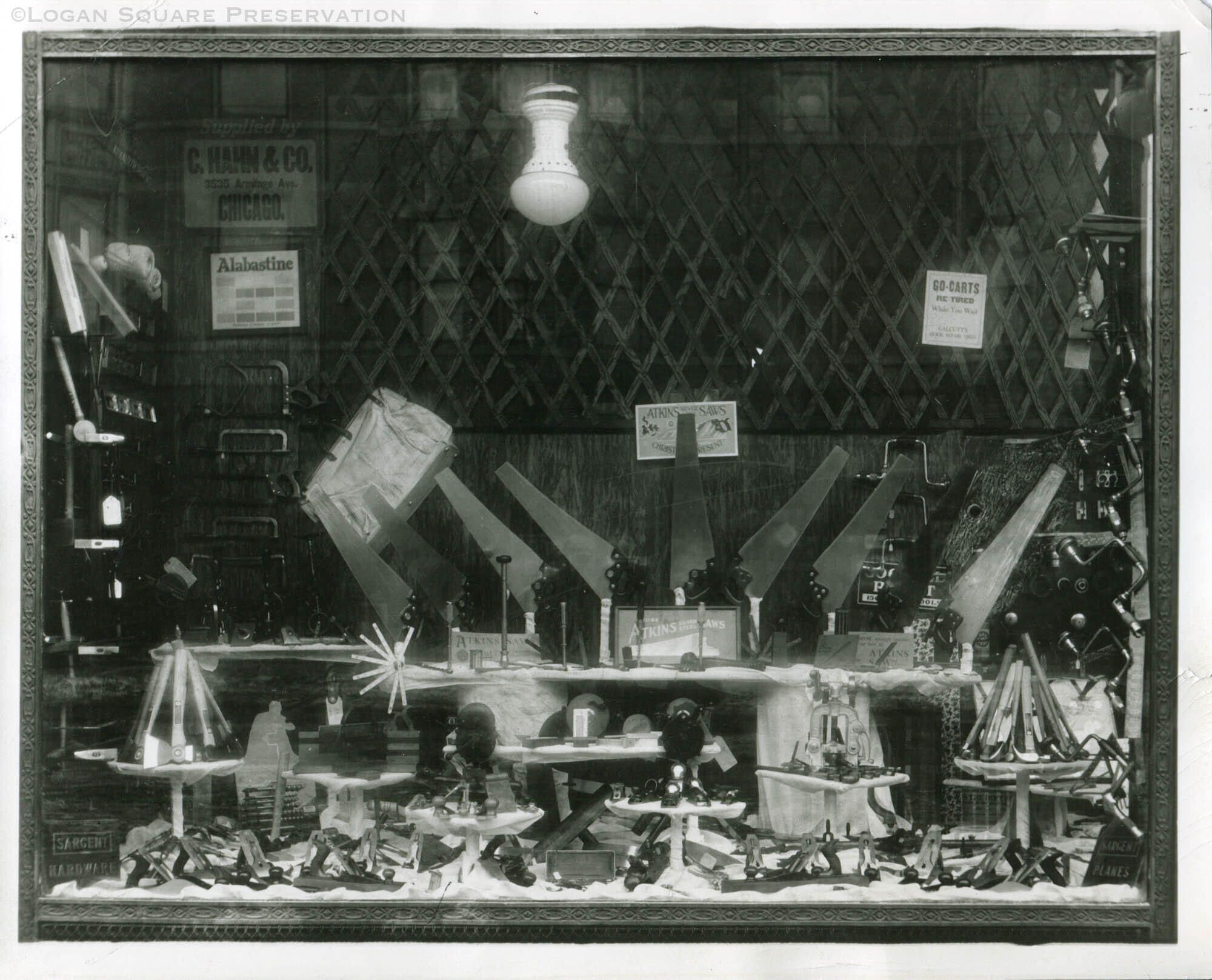 Promotional photo of saws, hatchets, hammers, planes and other tools arranged in hardware store window display, circa 1930s-1940sPhotograph Details
