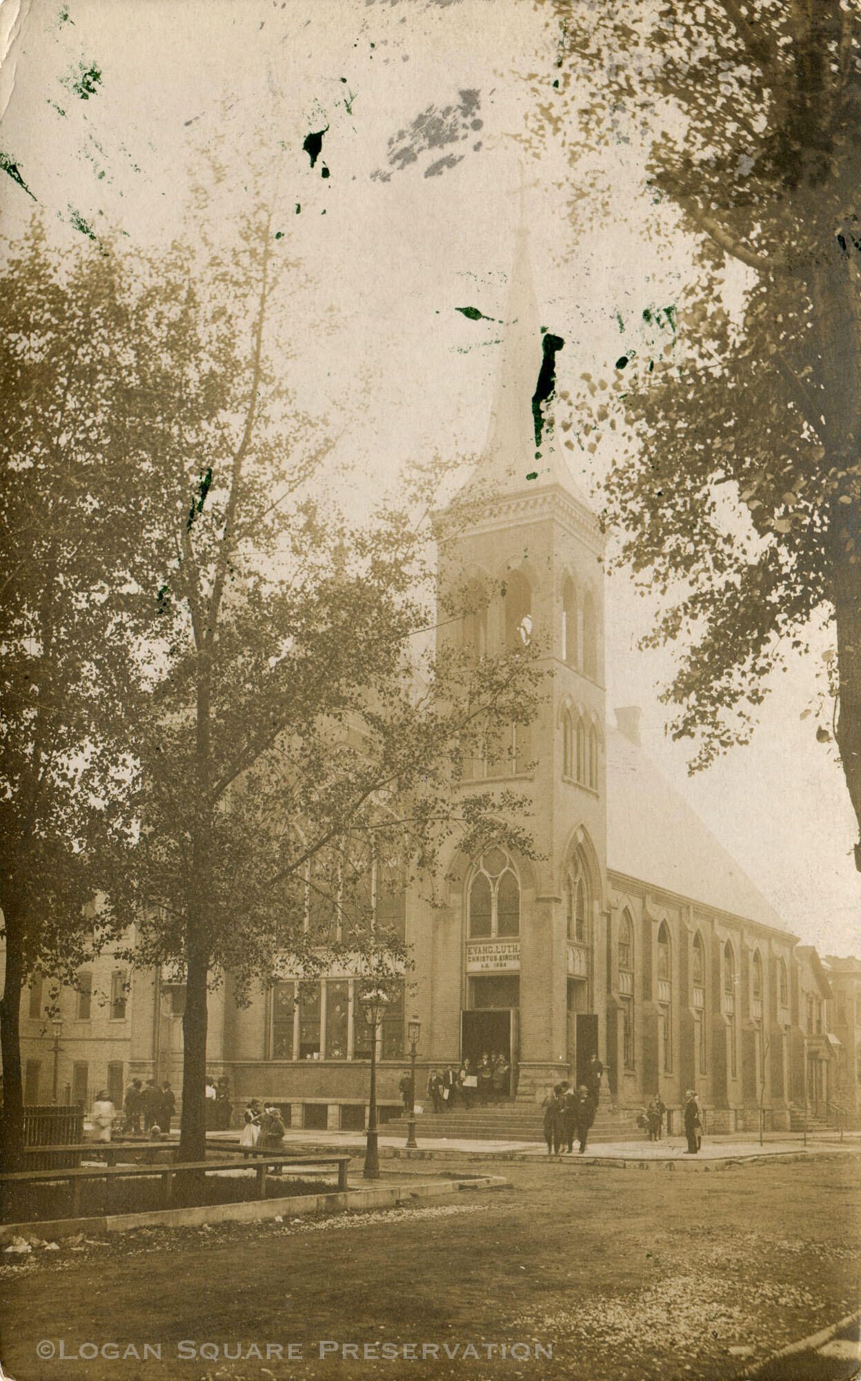 Real-photo postcard view looking southwest from McLean Ave at people descending stairs from open church doors, circa 1910Subject Person/Organization