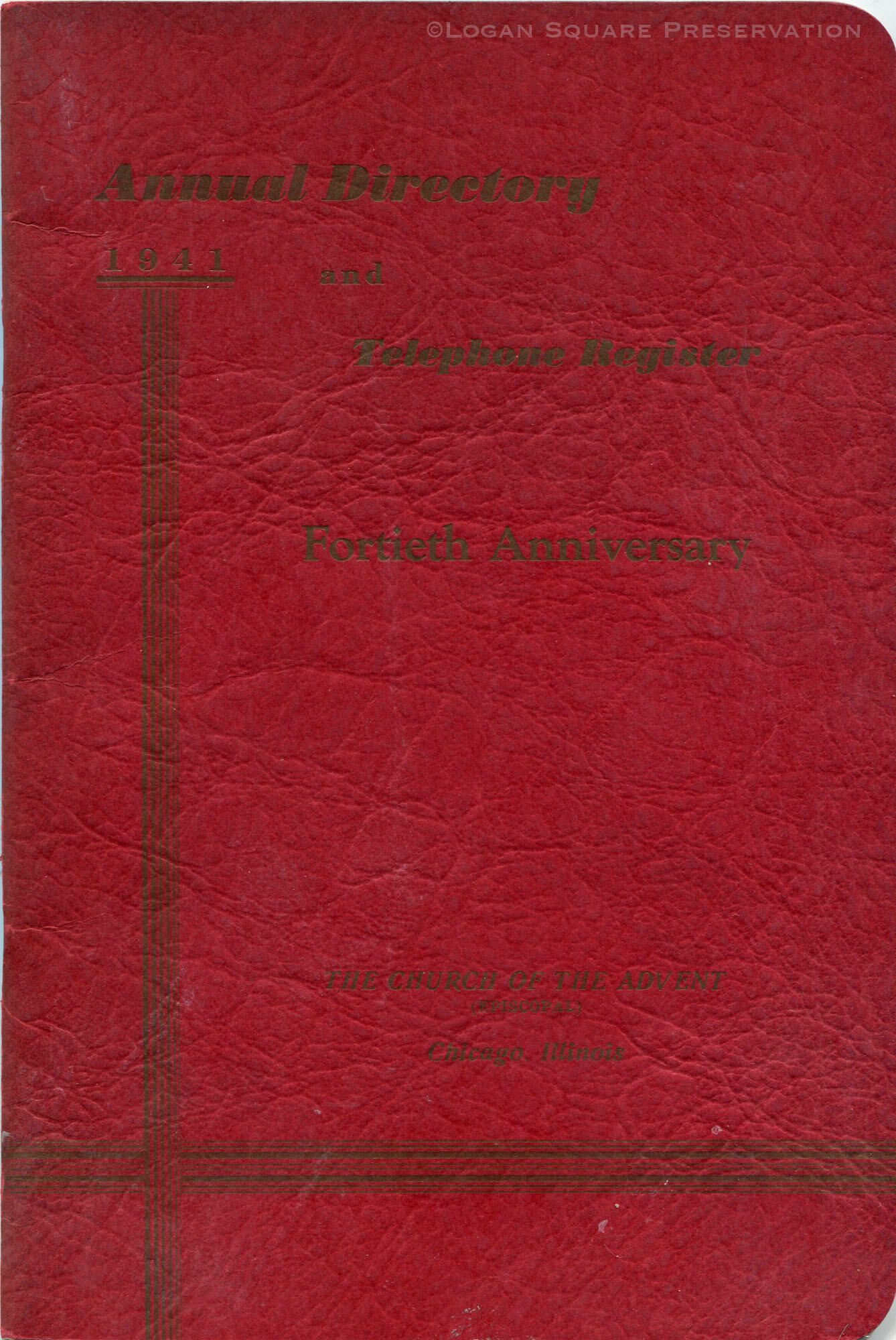 48-pg stapled booklet with red textured cover, 1941. Lists church members addresses and phone numbers, local business adsCollection