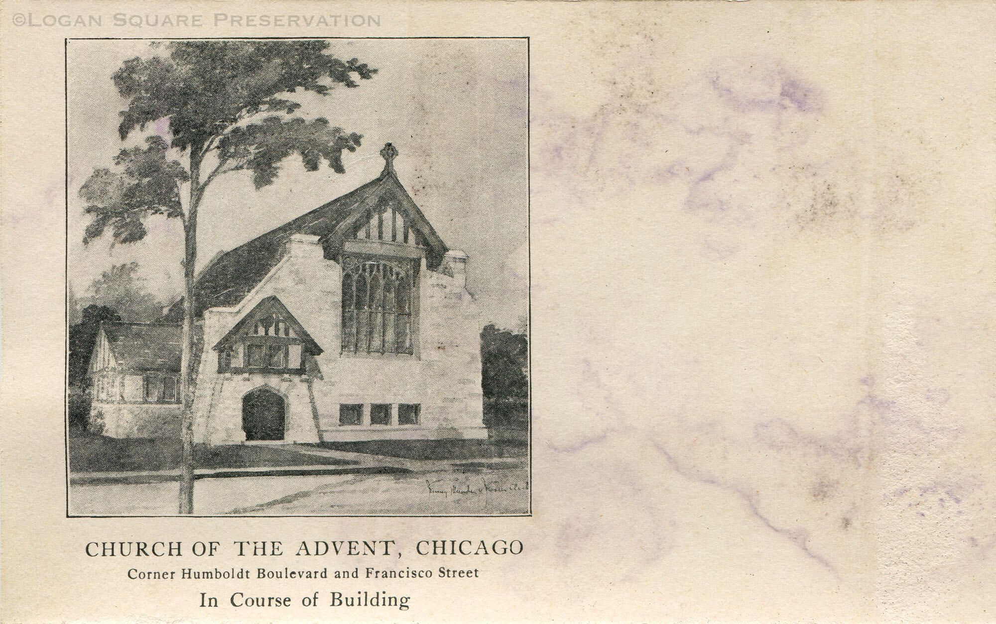 Printed postcard with rendering of original Church of the Advent building drawn by Jenny, Mundie & Jenson architects, built in 1905Subject Person/Organization