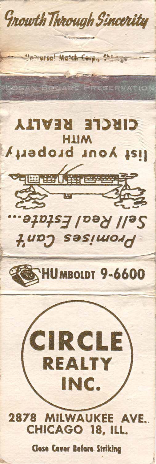 1.5" matchbook for real estate brokerage printed in gold ink on cream paper with stock illustration of ranch home on back, circa 1958Publication Details
