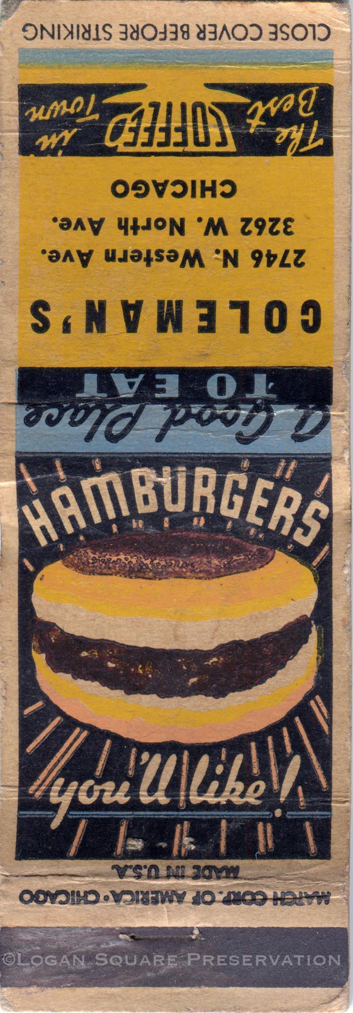 1.5" matchbook printed in yellow and blue ink on cream paper with stock illustration of hamburger on back, circa 1930sPublication Details