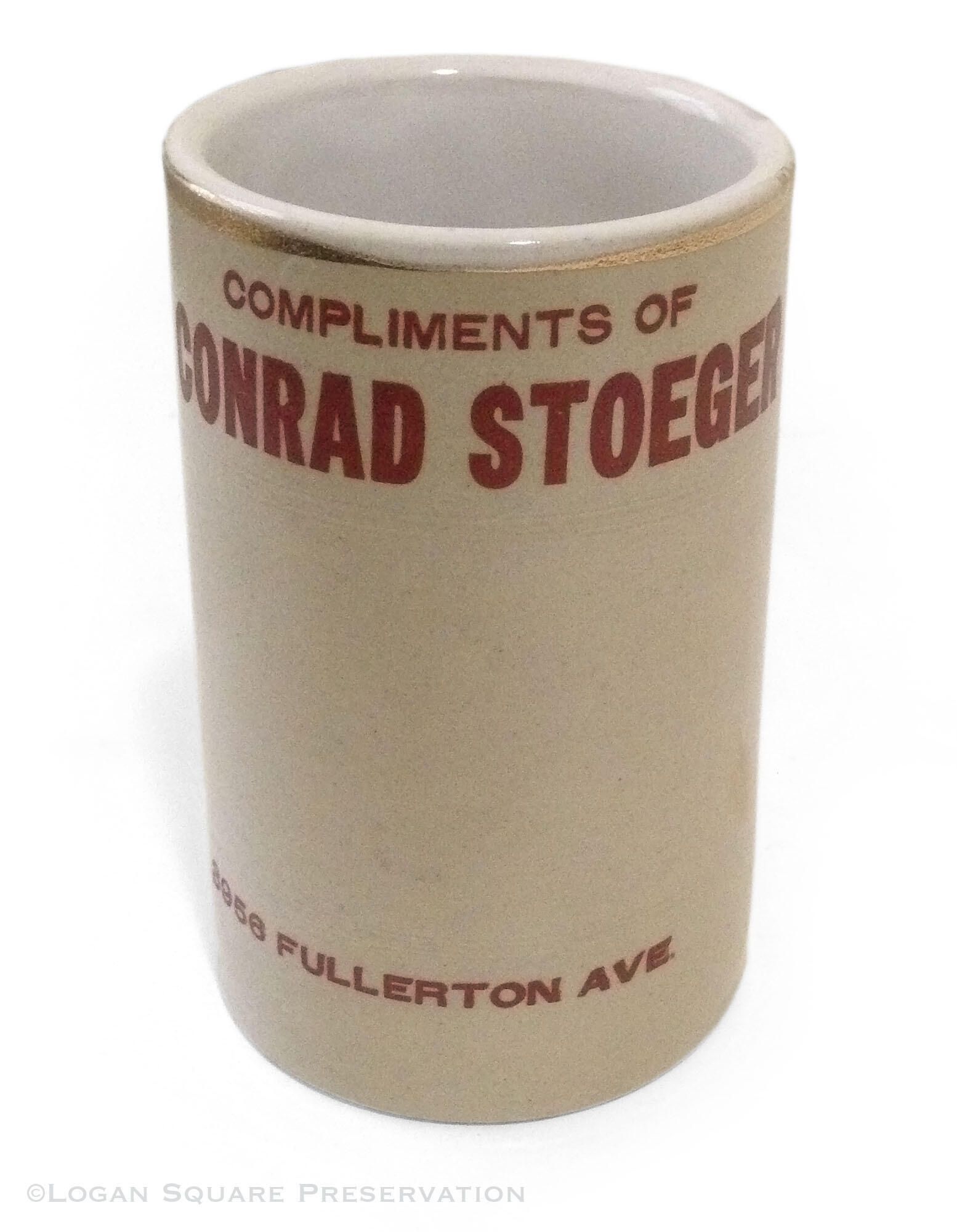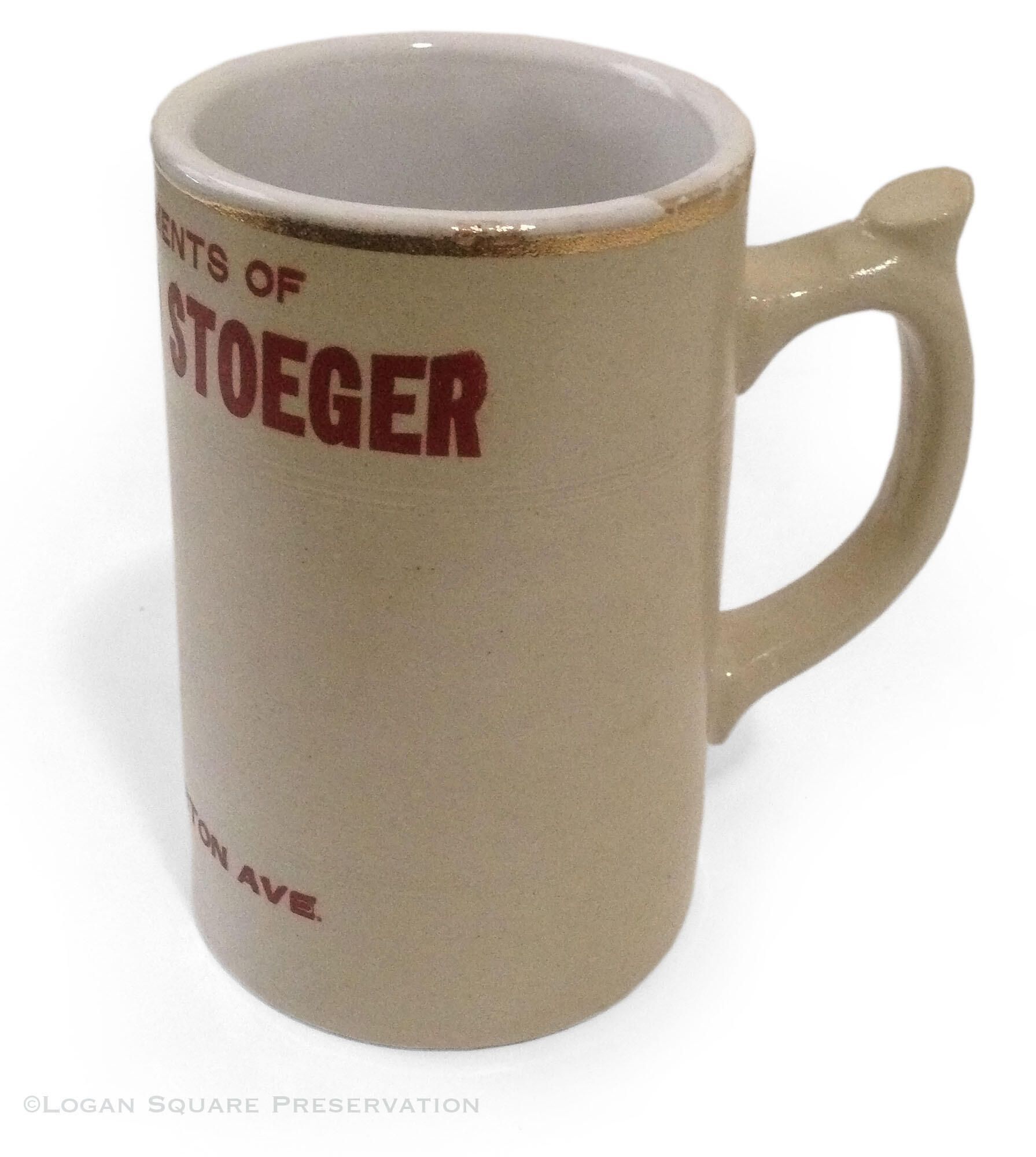 Glazed stoneware drinking mug with gold rim marked "Compliments of Conrad Stoeger", circa 1910sRelationships