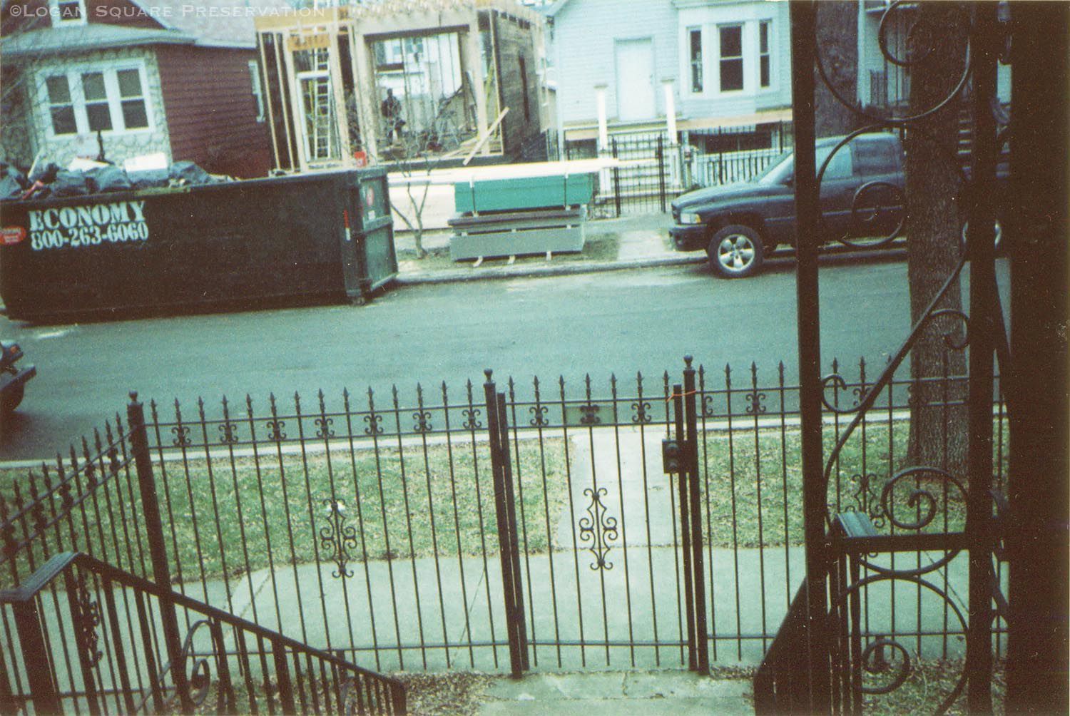 Snapshot photo looking out from porch at 2450 N. Richmond across street to construction of new single-family home replacing workers cottage at 2453 N. Richmond, circa early 2007Photograph Details