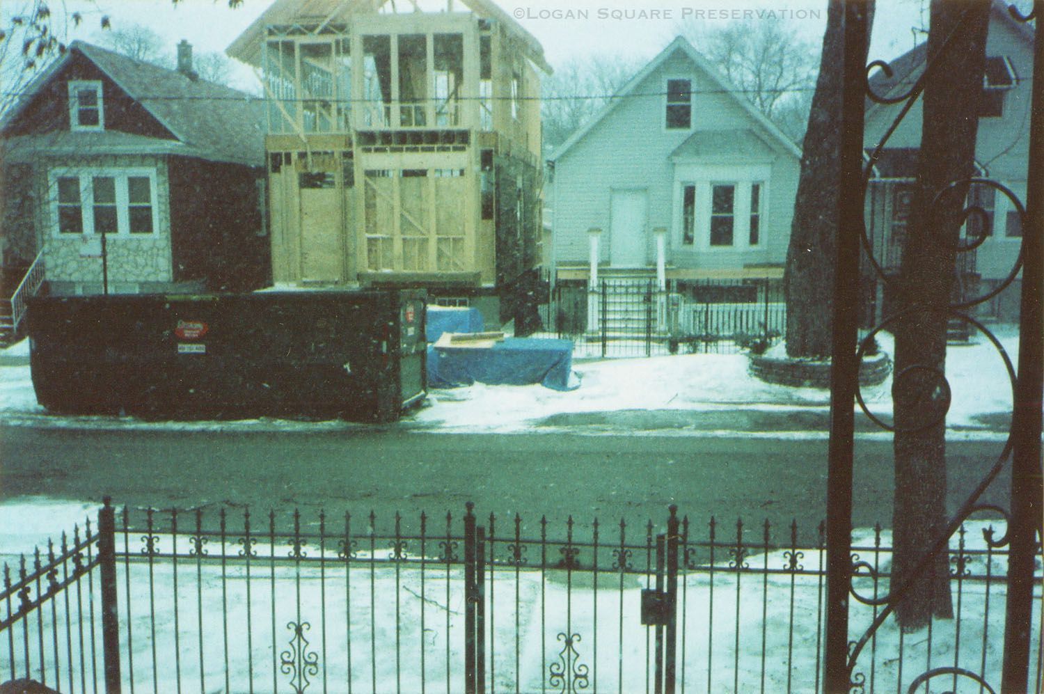 Snapshot photo looking out from porch at 2450 N. Richmond across street to construction of new single-family home replacing workers cottage at 2453 N. Richmond on snowy day, circa early 2007Photograph Details