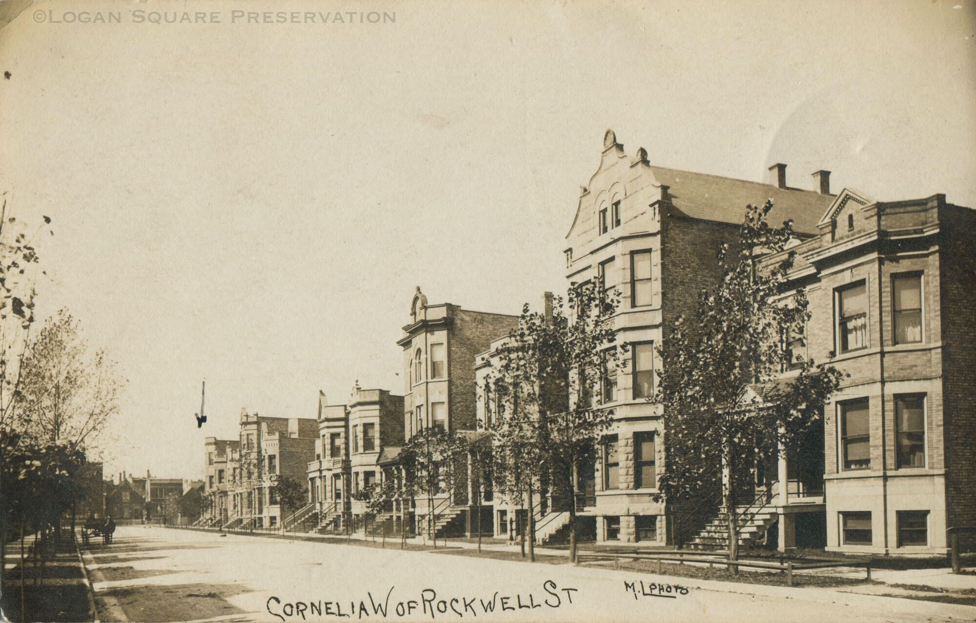 Real-photo postcard view looking west at two- and three-flat apartments on north side of 2600 block of W. Walton St (formerly Cornelia St), circa 1908. House at 936 N. Washtenaw marked with arrow.Subject