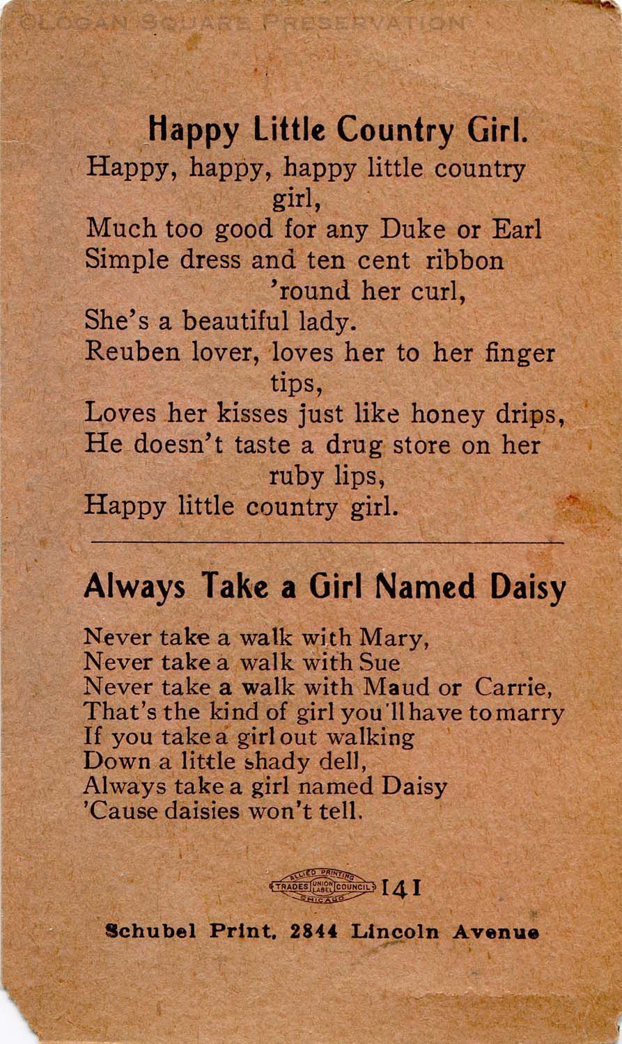 Invitation card to Oct 18, 1913 dance at Grace Hall given by Court Maplewood United Order of Foresters chapter #219 with music by Professor Rudolph Herforth. Lyrics to "Happy Little Country Girl" and "Always Take a Girl Named Daisy" on back.Publication Details