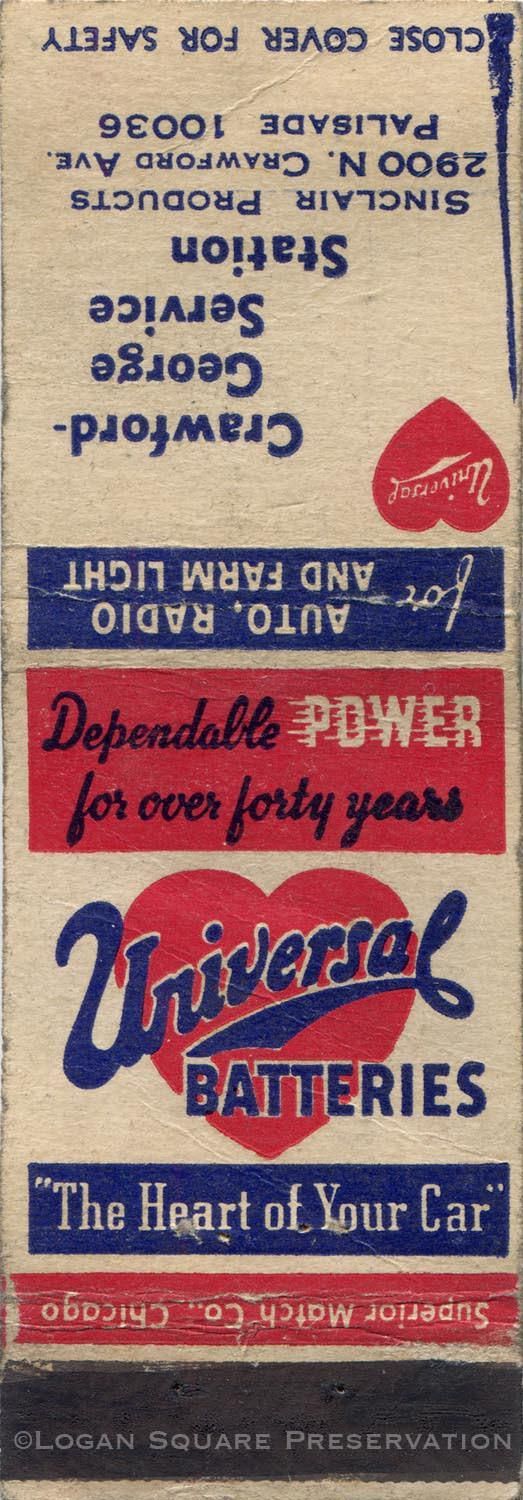 1.5" matchbook in red and blue ink on cream paper for gas station at northwest corner of George St & Pulaski Rd with stock advertisement for Universal Batteries on back, circa 1940sPublication Details