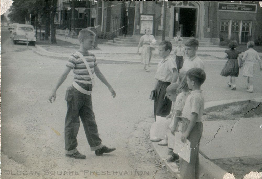 Snapshot photo looking northeast of boy in jeans, striped shirt and white belt standing in street in front of children holding papers and Bible waiting on curb facing Kimball Ave. In background, other children crossing Wrightwood Ave to and from Logan Square Methodist Church with doors open and string of pennants hanging over sidewalk, circa 1950sPhotograph Details