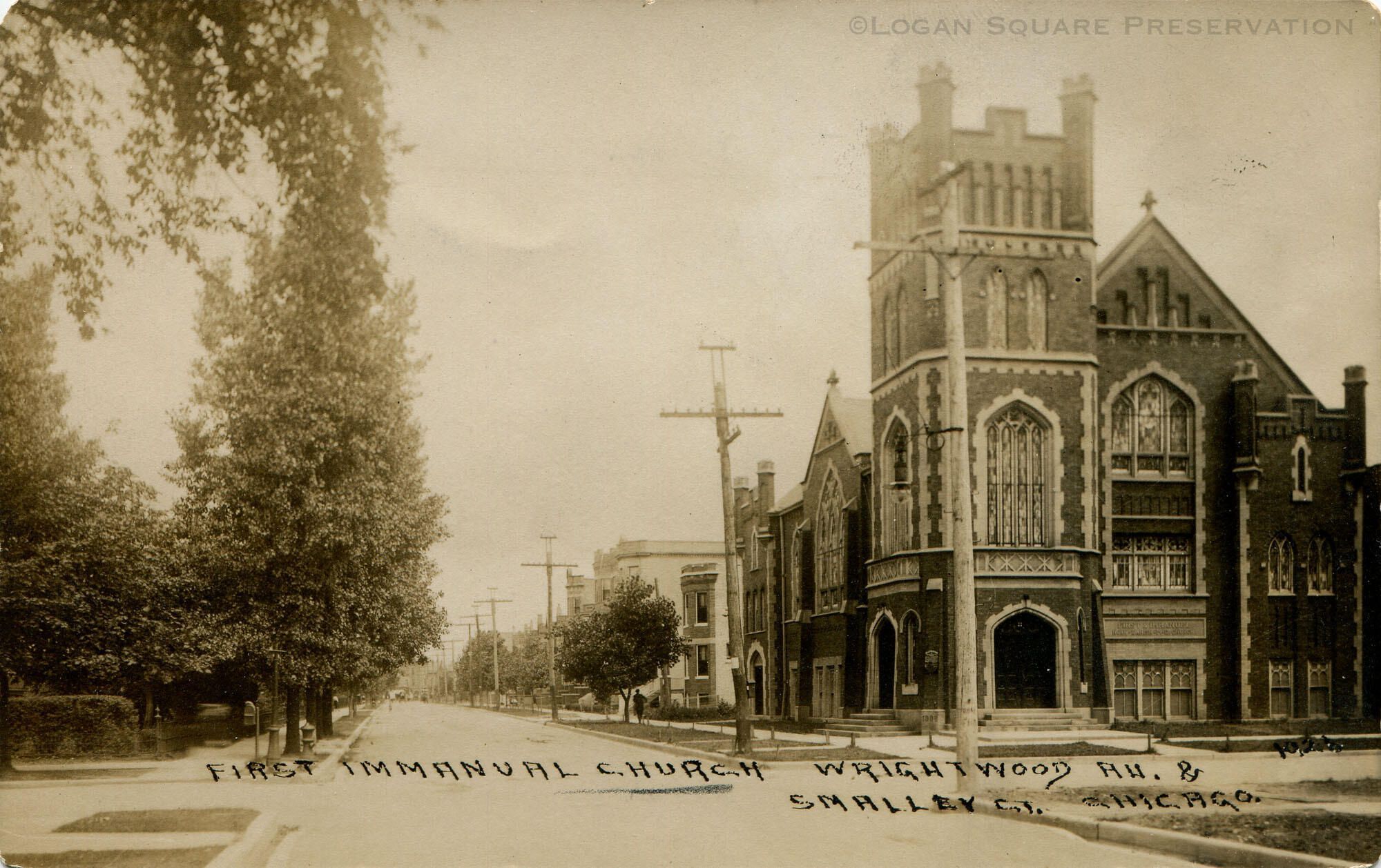 Real-photo postcard view looking northeast at First & Immanuel Church on corner of Wrightwood & Kimball, circa 1909Subject