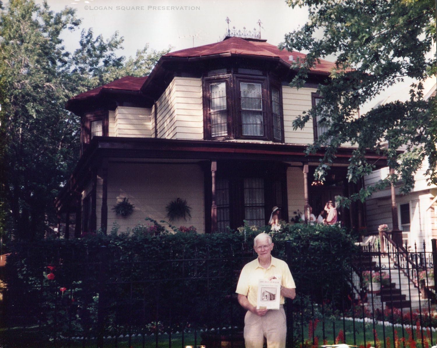 Enlarged reprint of Allan Alsaker holding Logan Square House Walk brochure in front of childhood home at 2656 W. Logan, Sep 1991Photograph Details