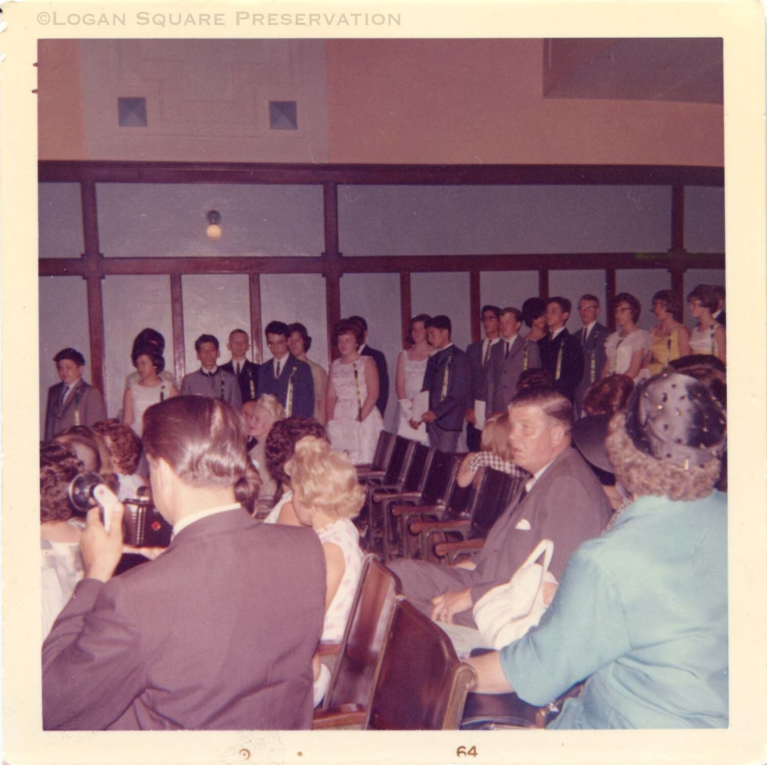 Snapshot view of students wearing ribbons assembling along wall of school auditorium for Darwin school 8th-grade graduation, 1964Photograph Details