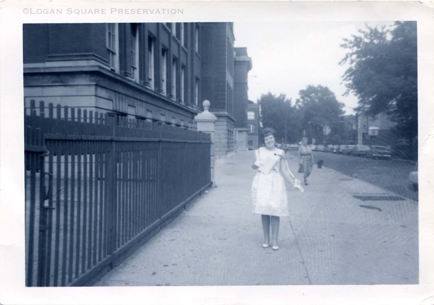 Snapshot photo of Diana Markey in white dress holding diploma outside schoolyard fence at Darwin School on graduation day 1964Photograph Details
