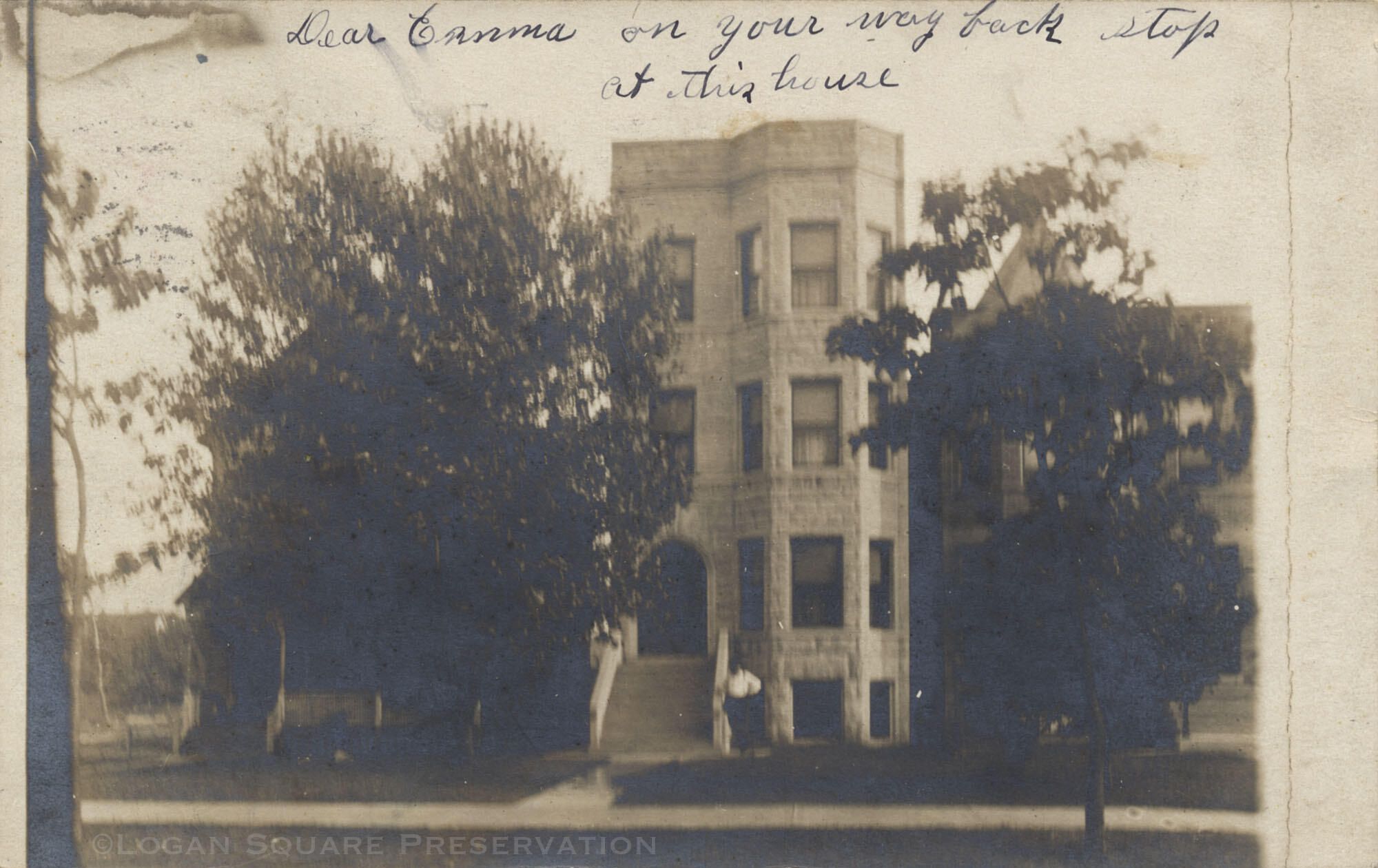 Real-photo postcard out-of-focus view looking south across Logan Blvd to house at 2649 W. Logan Blvd with woman standing at base of stairs with note above: "Dear Emma on your way back stop at this house"Subject Place