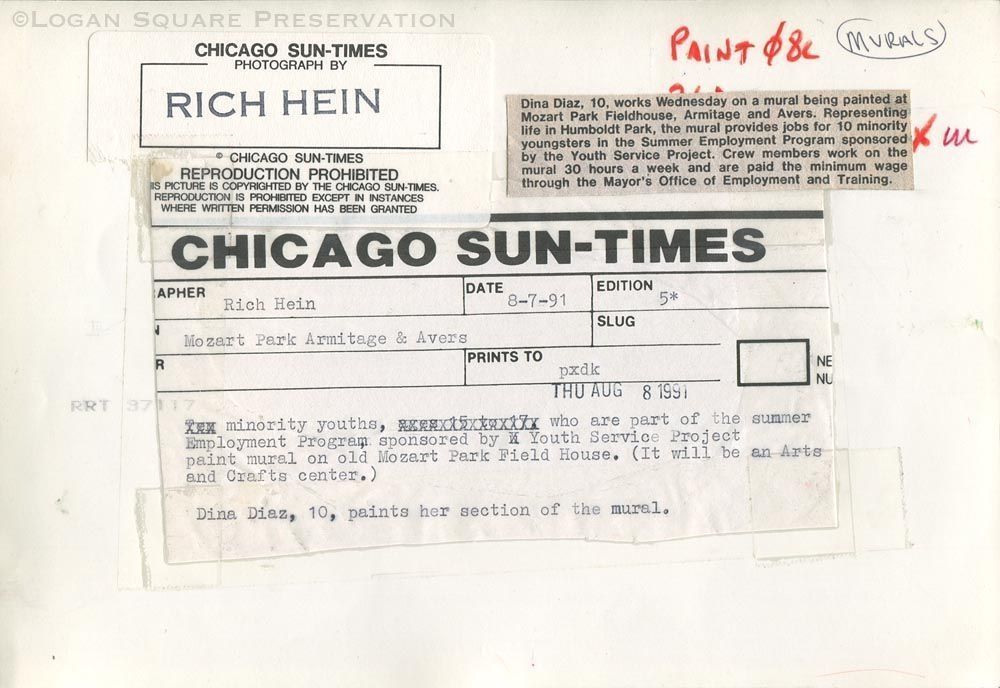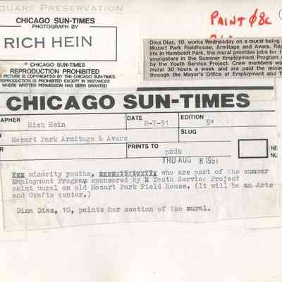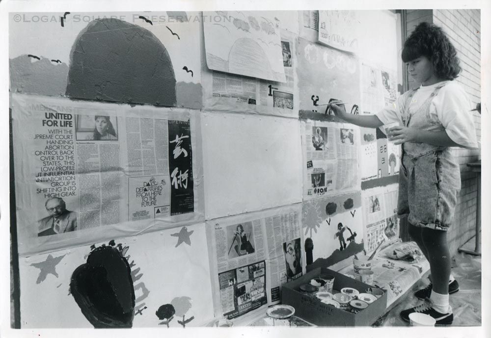 News photo of ten-year-old Dina Diaz painting contribution to mural on wall at Mozart Park fieldhouse sponsored by city summer employment program, 1991Photograph Details