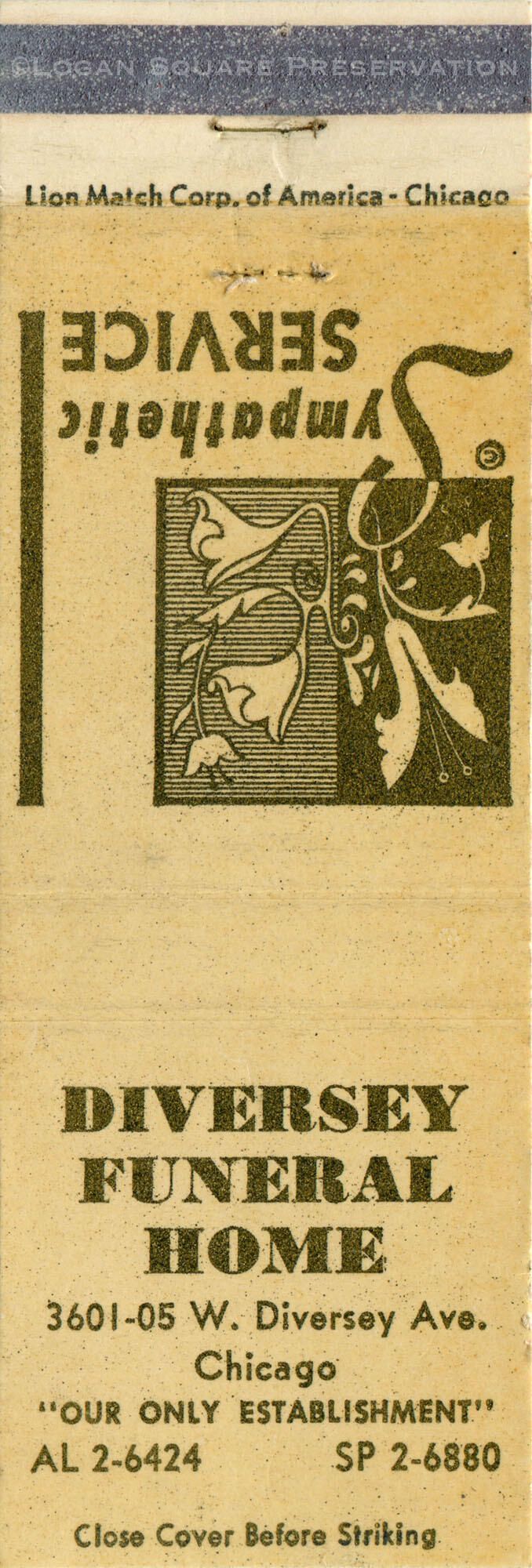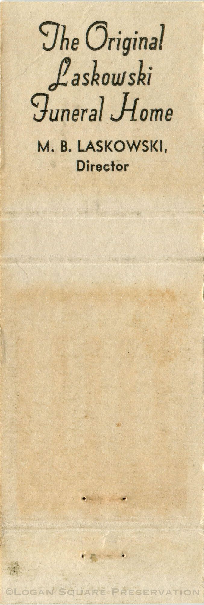 1.5" cream matchbook printed in gold ink with illustration of flower "Sympathetic Service", circa 1950s. Printed note inside cover "The Original Laskowski Funeral Home: M.B. Laskowski, Director"Publication Details