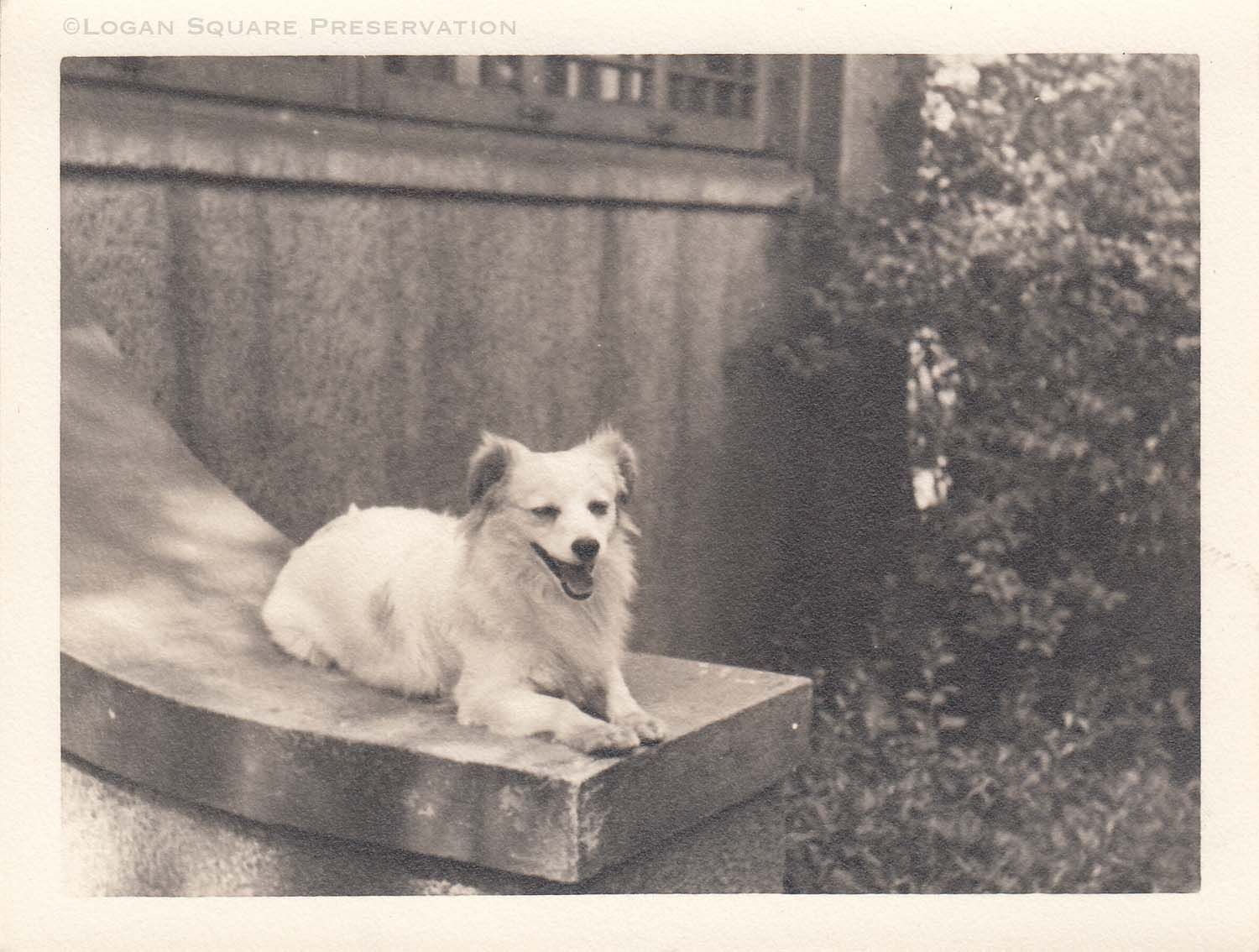 Snapshot photo of small dog sitting on stair railing at 3230 W. Belden, most likely photographed by Albert Fricke, circa 1940sPhotograph Details