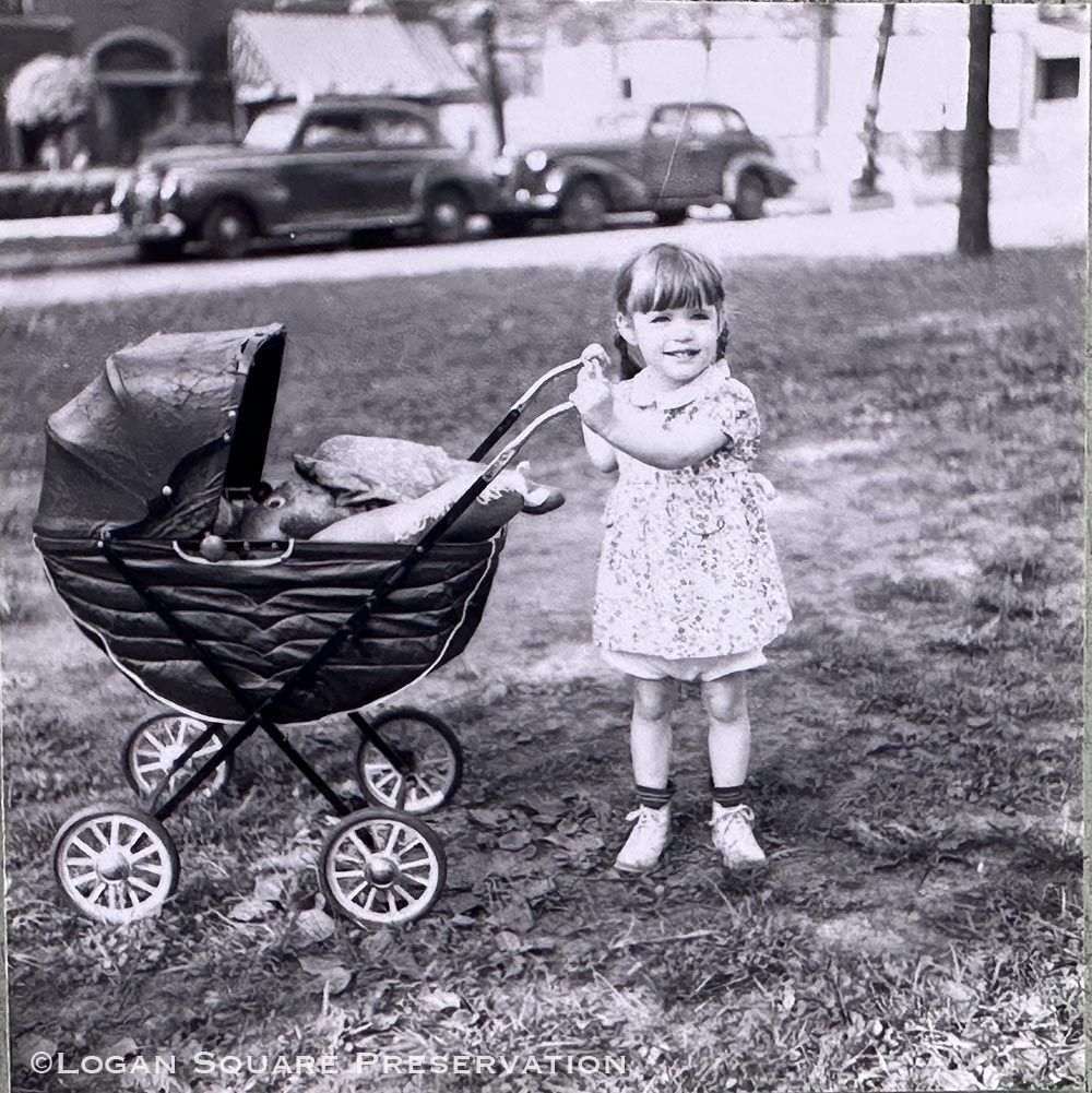 Photo of snapshot of Dianne Lyon pushing doll buggy in grass on Logan Boulevard with awning of Ben's Sweet Shop in background, 1946Photograph Details