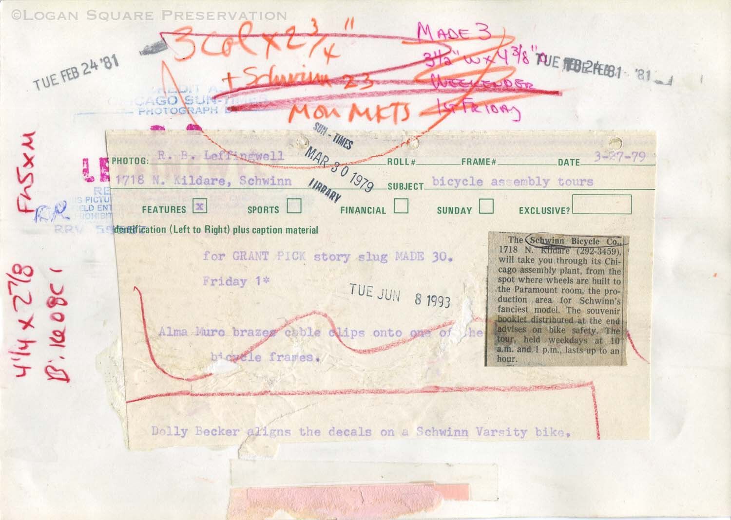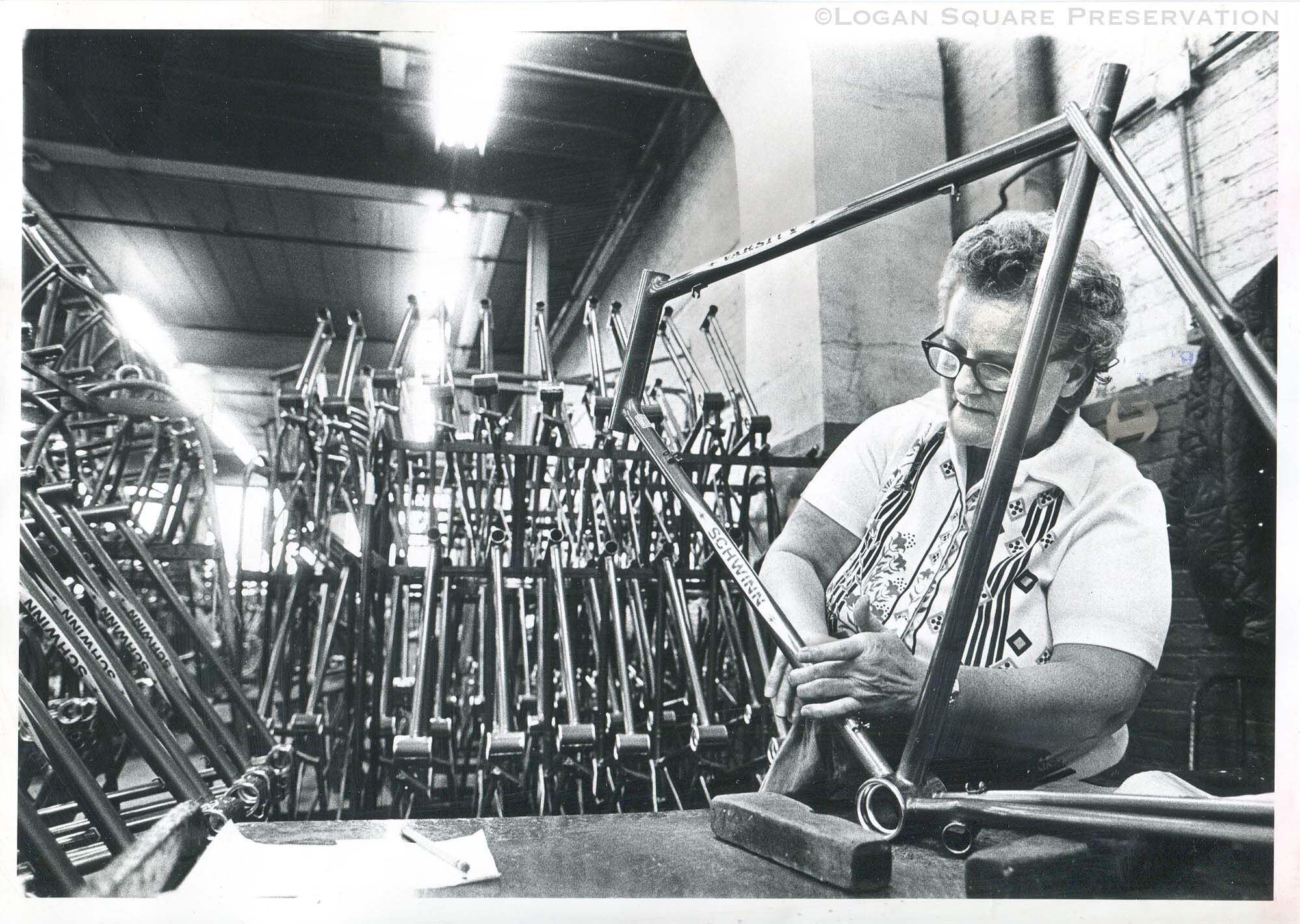 News photo of Schwinn employee Dolly Becker applying decals to Schwinn Varsity bicycle frame. Phot taken for newspaper article about public tours of Schwinn factory, March 1979Photograph Details