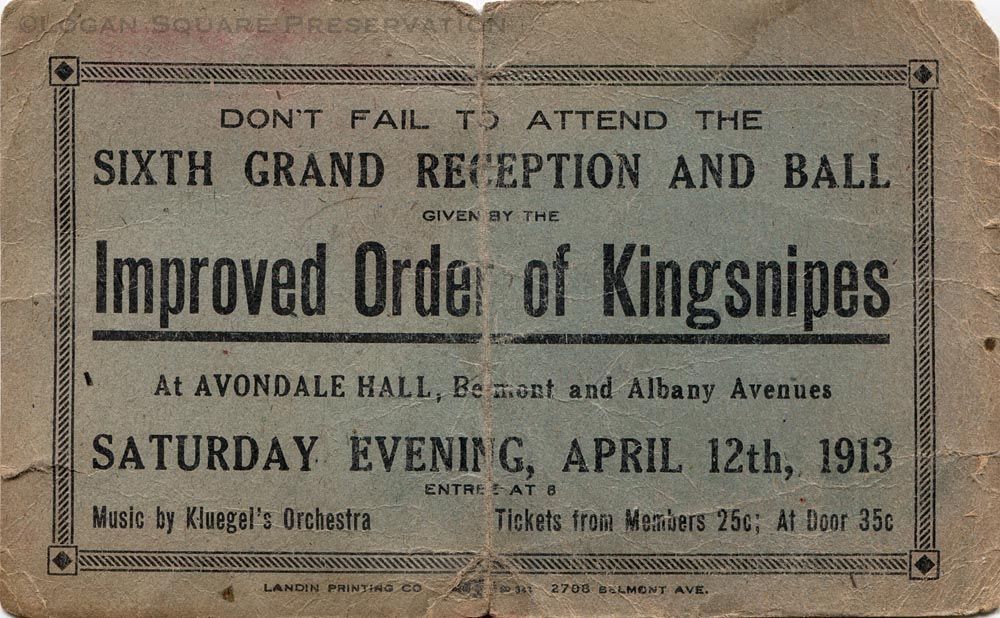 Invitation card to Apr 12, 1913 dance at Avondale Hall given by the Improved Order of Kingsnipes with music by Kluegel's Orchestra. Lyrics to "At the Devil's Ball" and "Row Row Row" on back.Publication Details