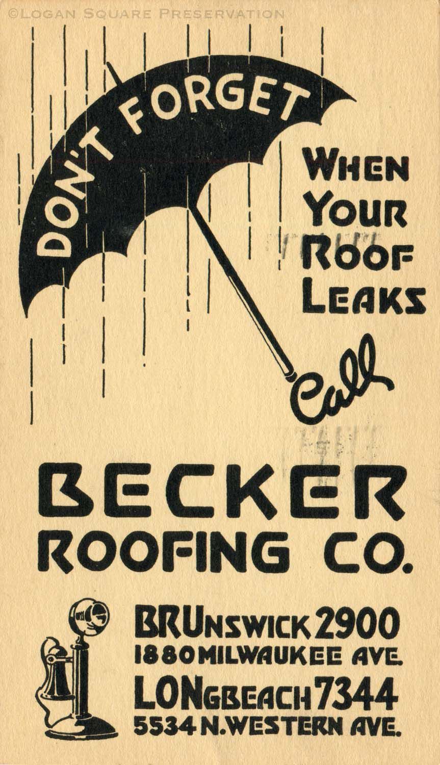 Advertising postcard with illustration of umbrella and telephone next to phone number for Becker Roofing Company, mailed to Andrew Erbach Jan 13, 1934Subject Person/Organization
