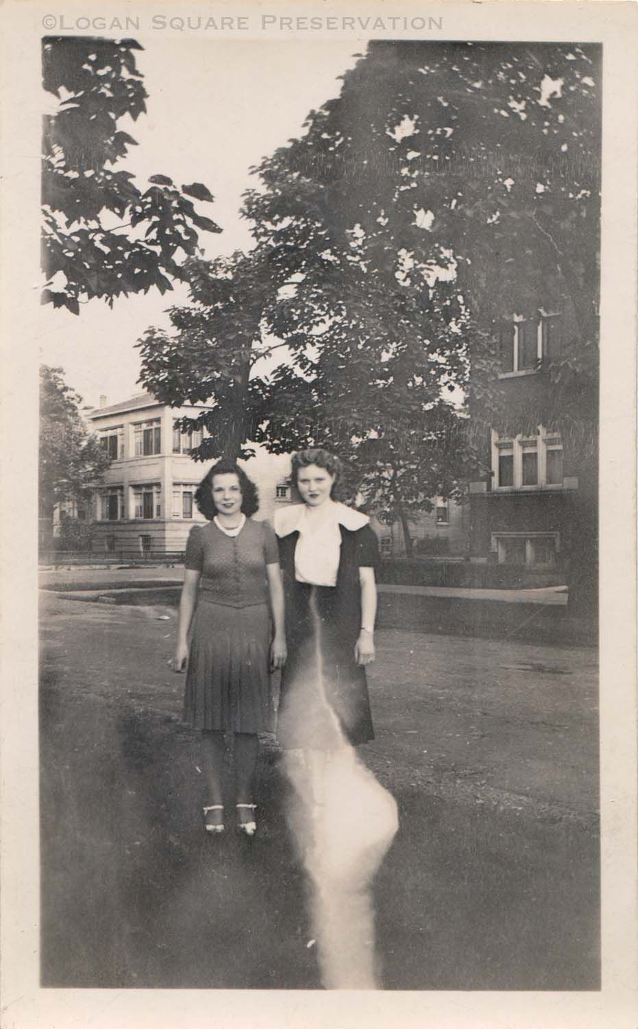 Snapshot photo of two women standing on median of Logan Boulevard in front of 2935 W. Logan Blvd, identified on back as 19-year-old friends Dorothy Dember and Rita Fye, 1939Photograph Details
