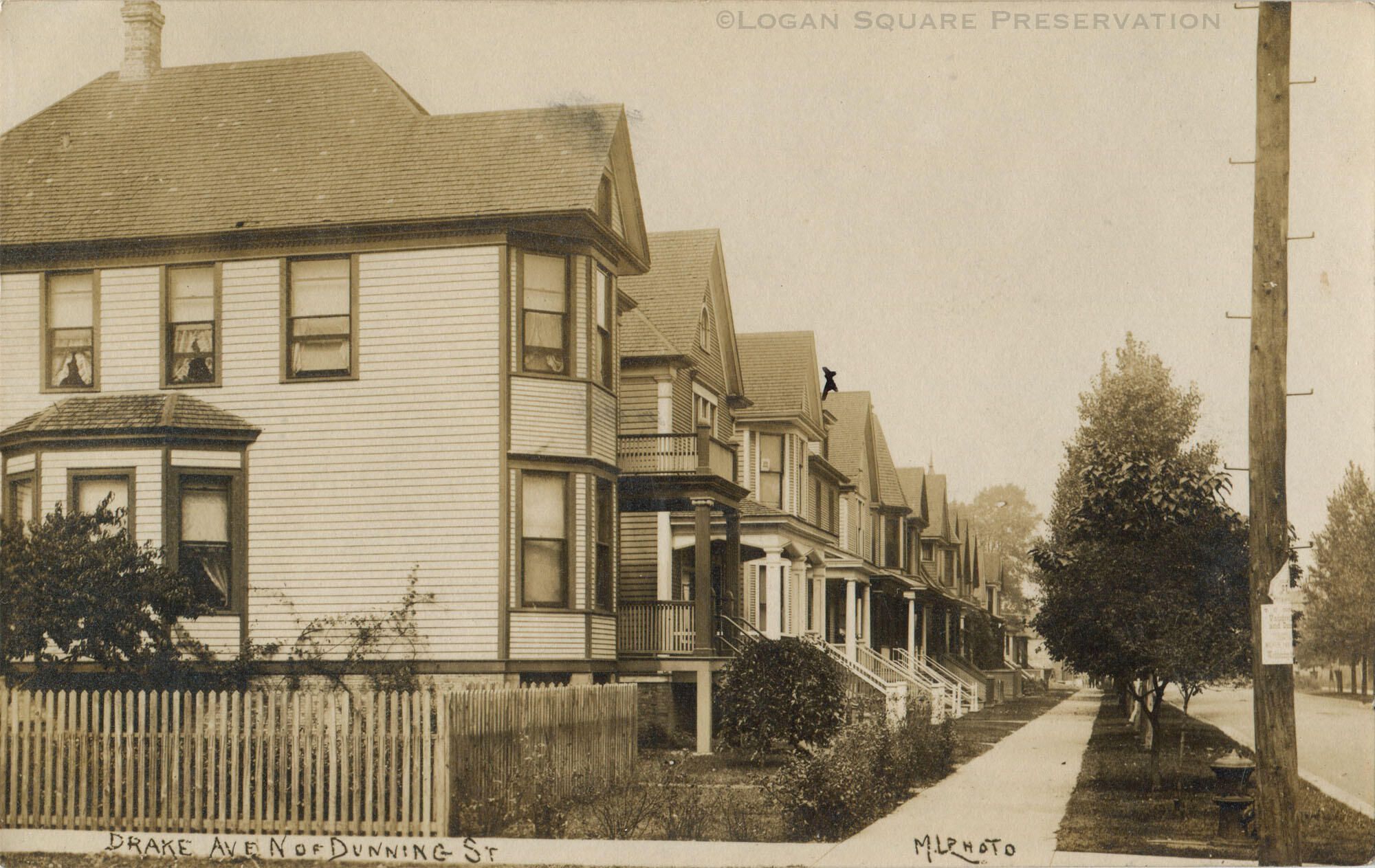 Real-photo postcard view looking north at frame houses on west side of 2500 block of N. Drake Ave, circa 1907-1908. Upper floor of house at 2510 N. Drake marked with "X"Subject