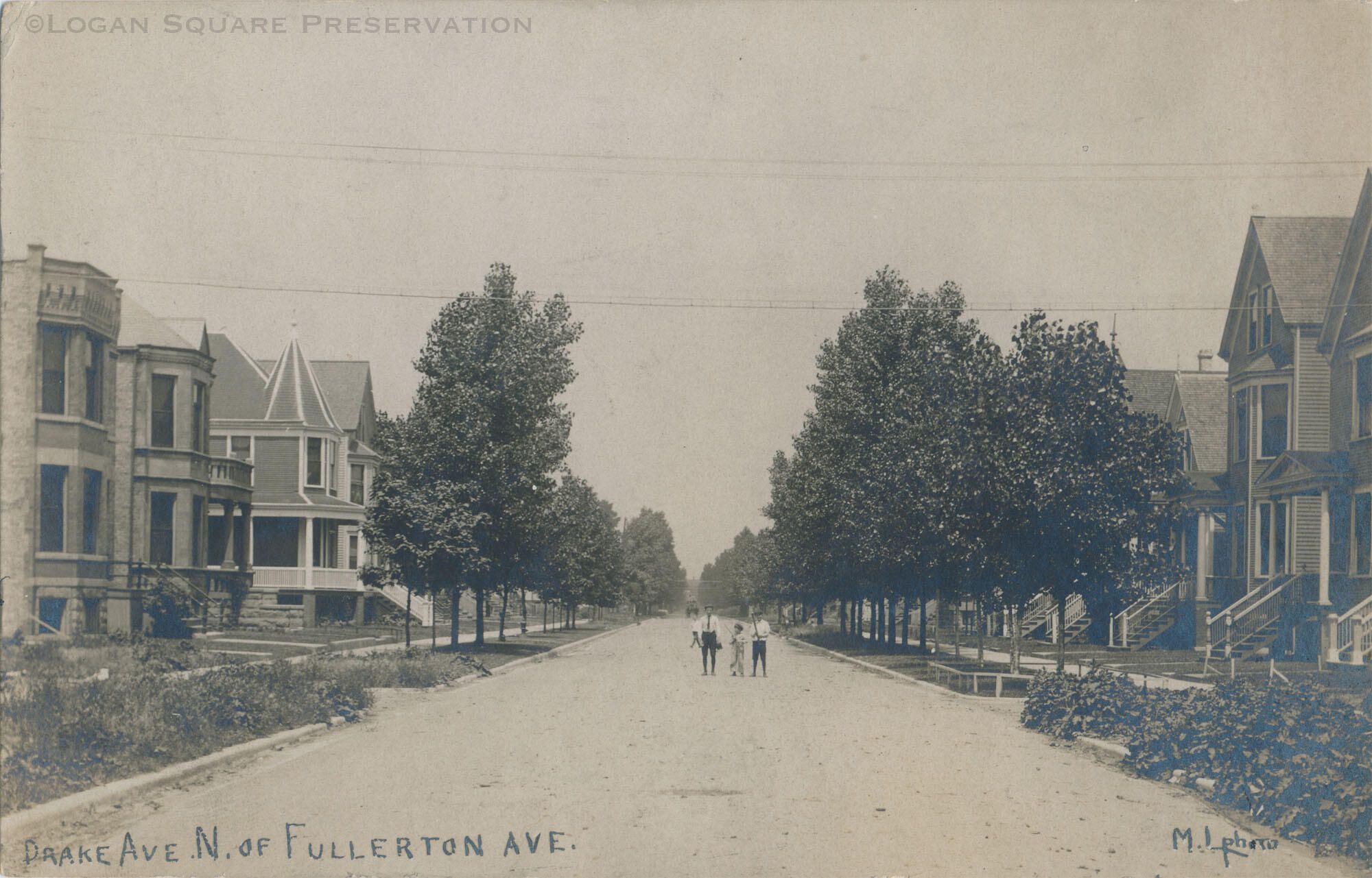 Real-photo postcard view looking north at 2400 block of N. Drake Ave circa 1908. Children playing baseball in middle of street.Subject