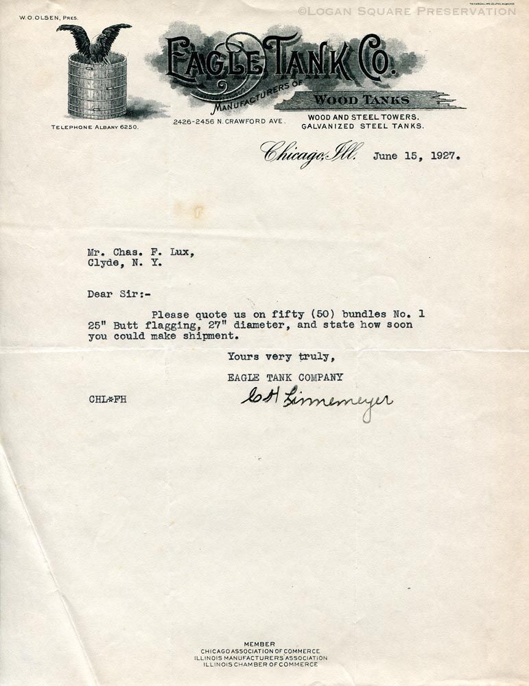 Business letter request for price quote on Eagle Tank Co. letterhead sent by Clara H. Linnemeyer to Charles F. Lux, 1927Publication Details