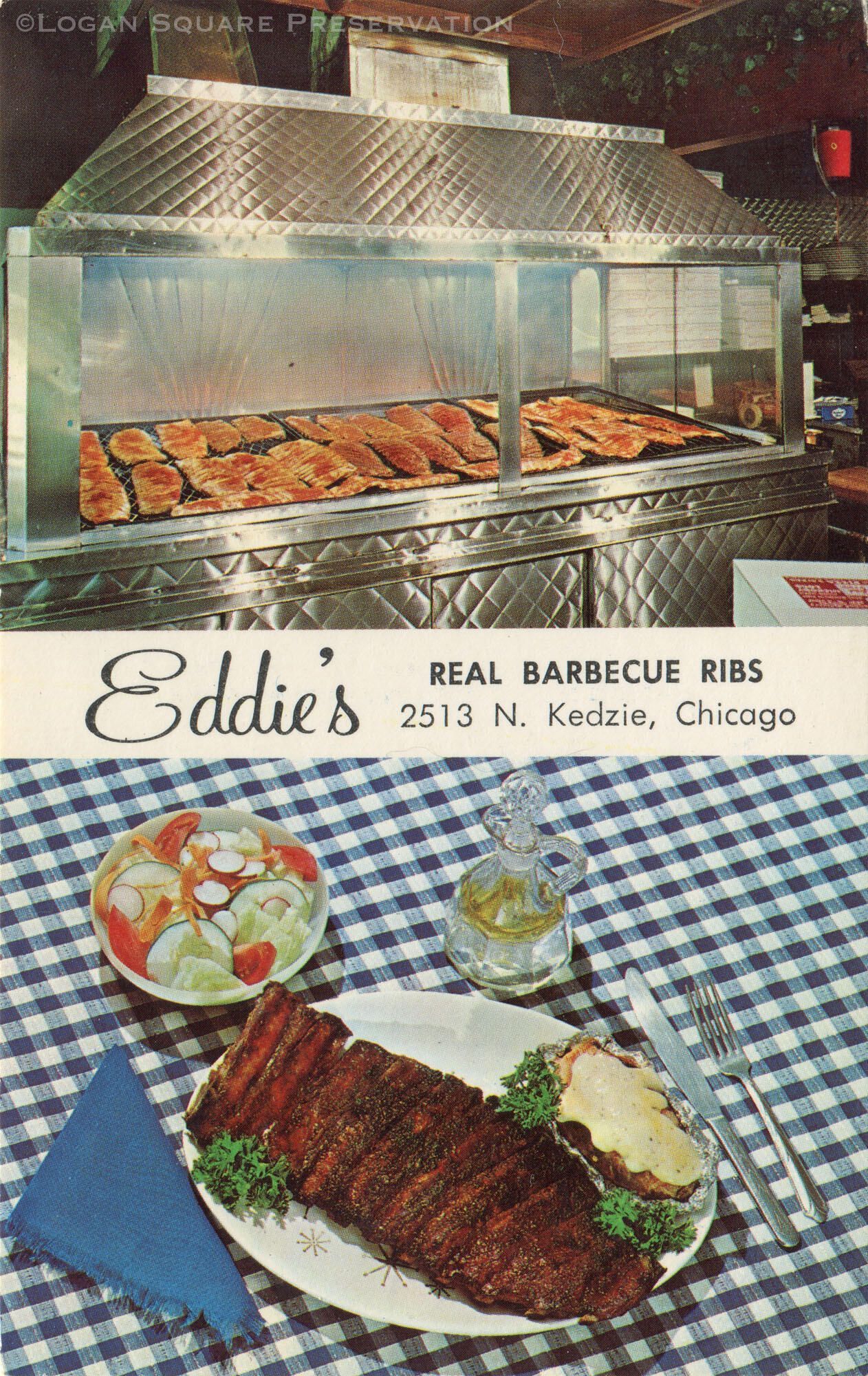 Chrome postcard with view of restaurant grill and plate of barbecue ribs with potato and side salad on checkered tablecloth, circa 1960sSubject Person/Organization