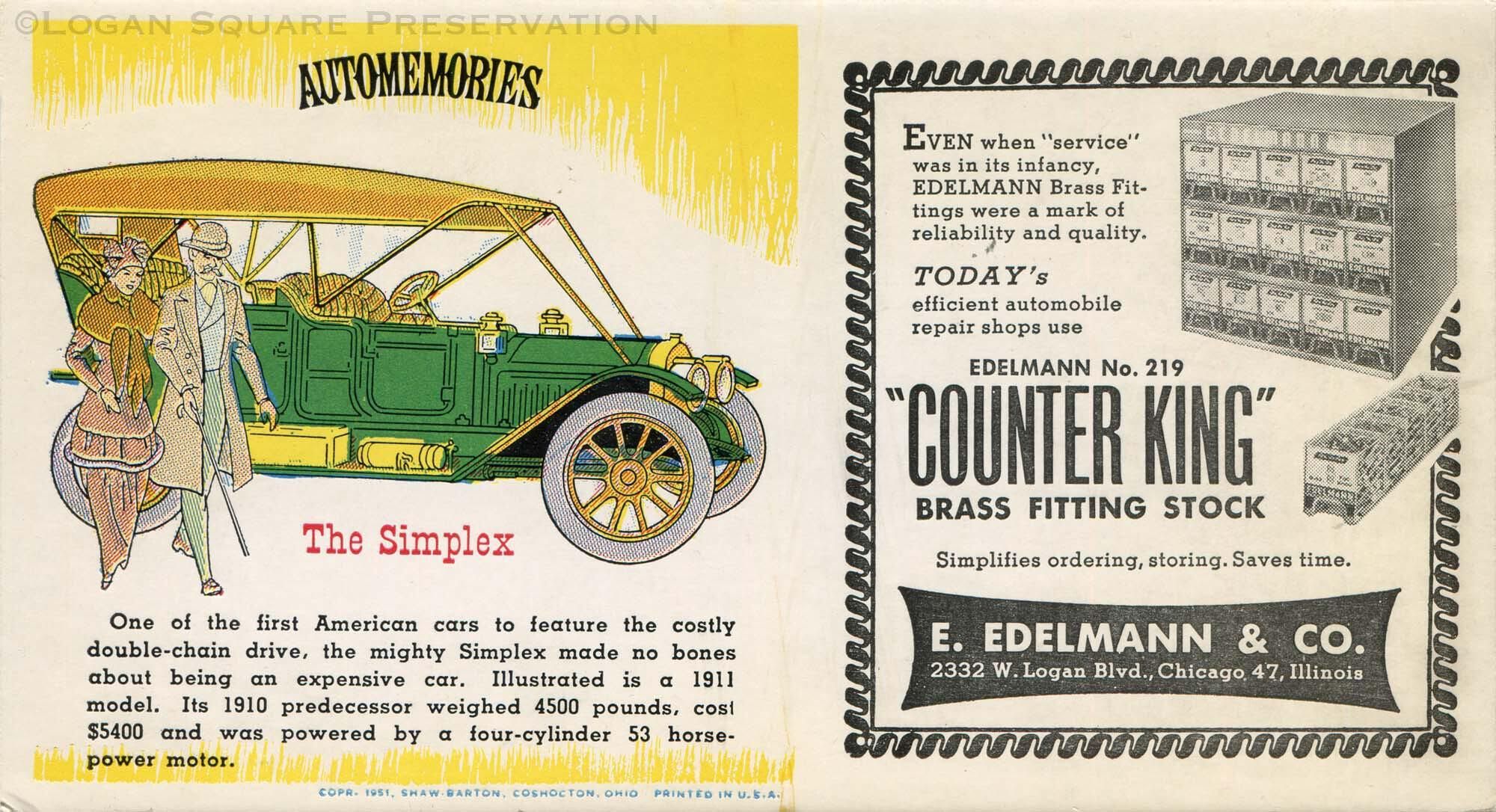 Automemories promotional ink blotter card with illustration of 1911 Simplex automobile and advertisement for Edelmann No. 219 "Counter King" brass fitting stock cabinet, 1951Publication Details