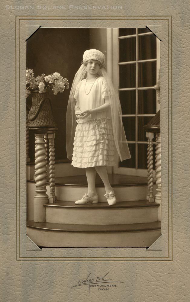 Studio portrait of unidentified girl standing on staircase in a white dress, veil and gloves holding prayer book and rosary, mounted on cardstock folder, circa 1920s-1930sPhotograph Details