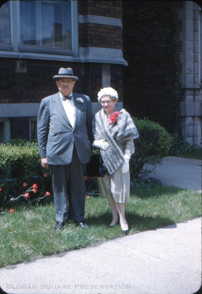 35mm color Kodachrome slide transparency view of architect Edward Rupinski and wife Mary in front yard of their home at 2532 N. Richmond on Mothers Day, 1959Photograph Details