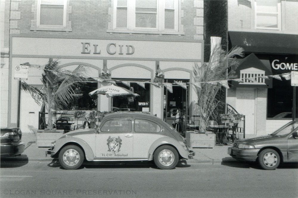 Black & white photo looking east across Kedzie Ave at El Cid restaurant facade and outdoor seating with palm trees behind parked restaurant Volkswagen beetle, circa 2000-2010Photograph Details