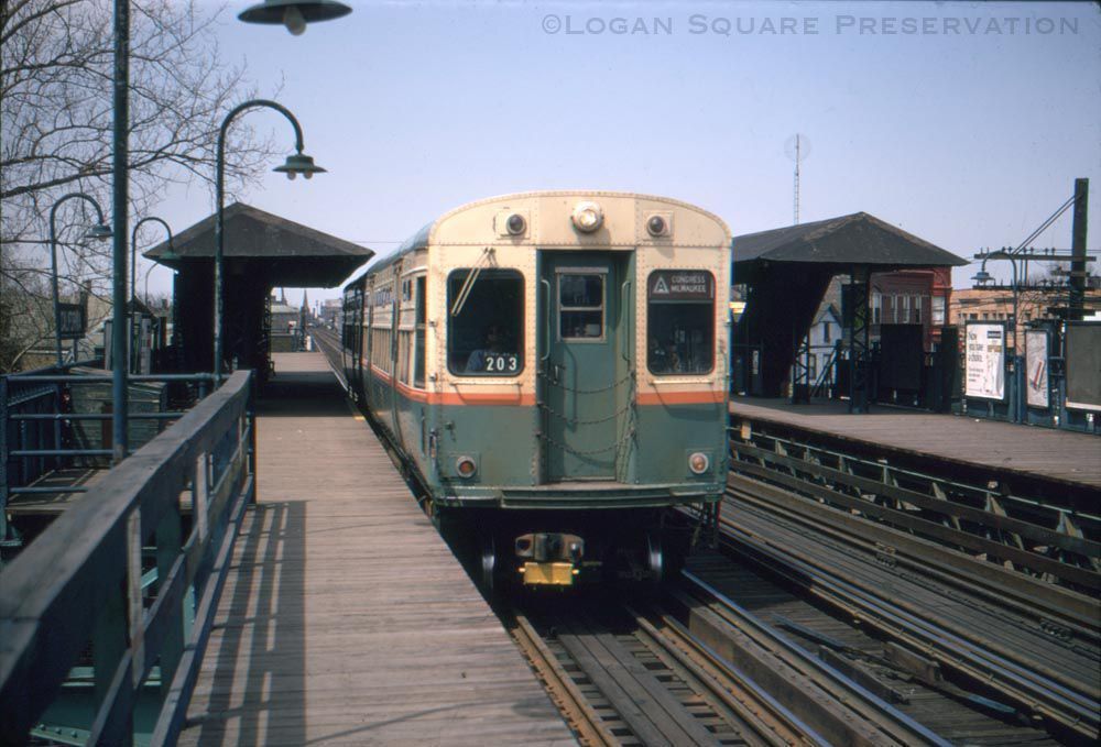 35mm Kodachrome color slide view looking northwest at Congress-Milwaukee A train at California CTA station with buildings on California Ave in distance, taken April 25, 1970.Photograph Details