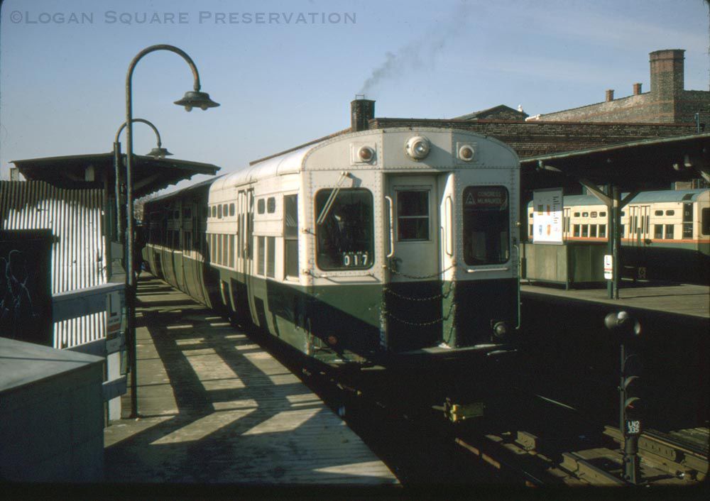 35mm Kodachrome color slide view looking west at two elevated trains at Logan Square CTA terminal with brick maintenance building and Logan Square Auditorium in background, taken January, 1970.Photograph Details