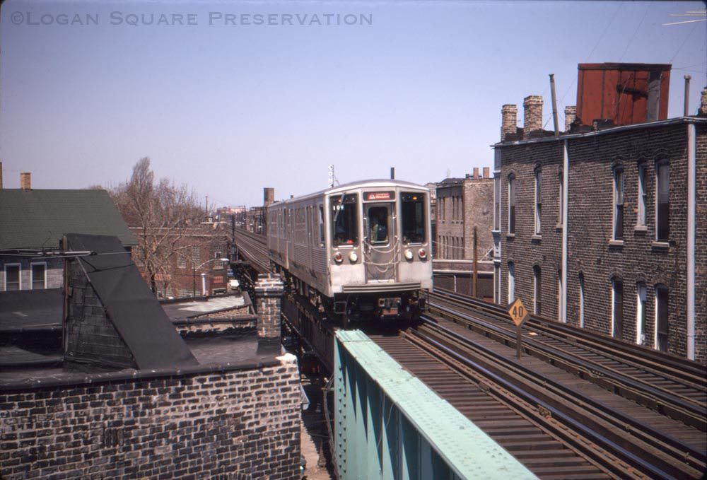 35mm Kodachrome color slide view looking northwest at Congress-Milwaukee A train pulling into Western Avenue CTA station with buildings on either side, taken April 25, 1970.Photograph Details