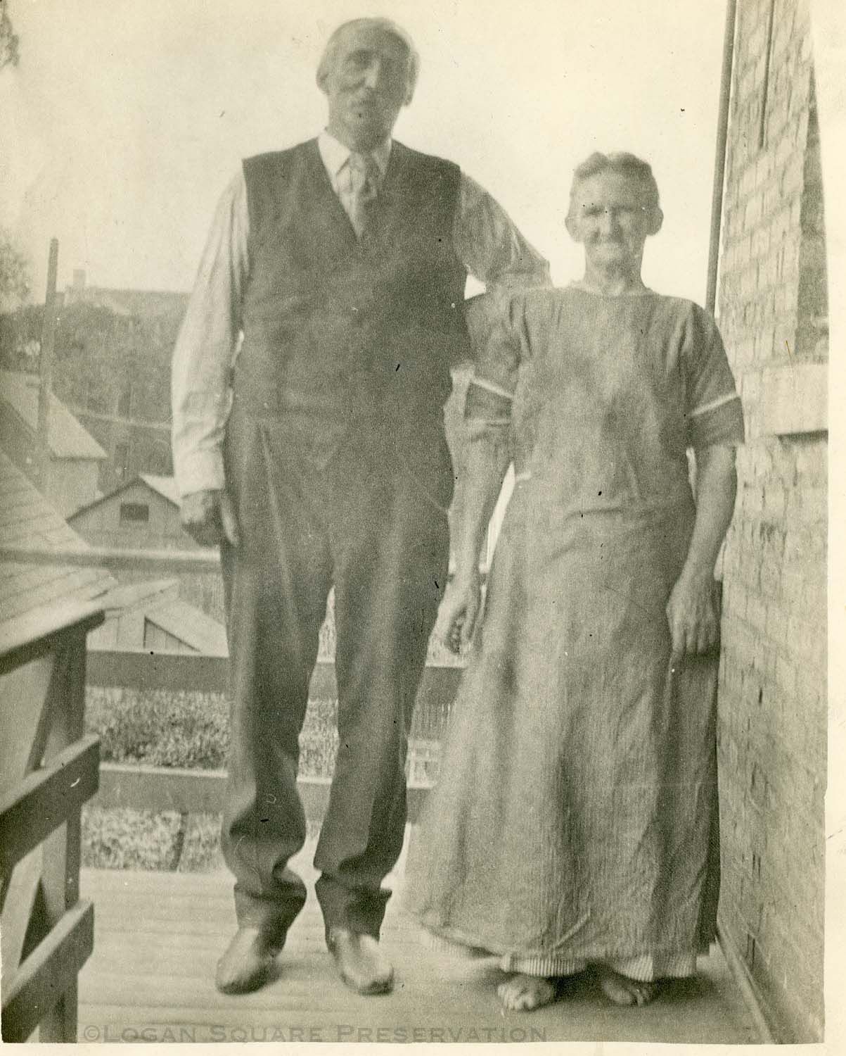 Photo of Ernst and Minnie Buchholz, owners of Overbeck Hall, standing on back wooden porch of building, with woodframe buildings along alley and greystone 3-flat at 2336 N. Maplewood in background, circa 1910Photograph Details