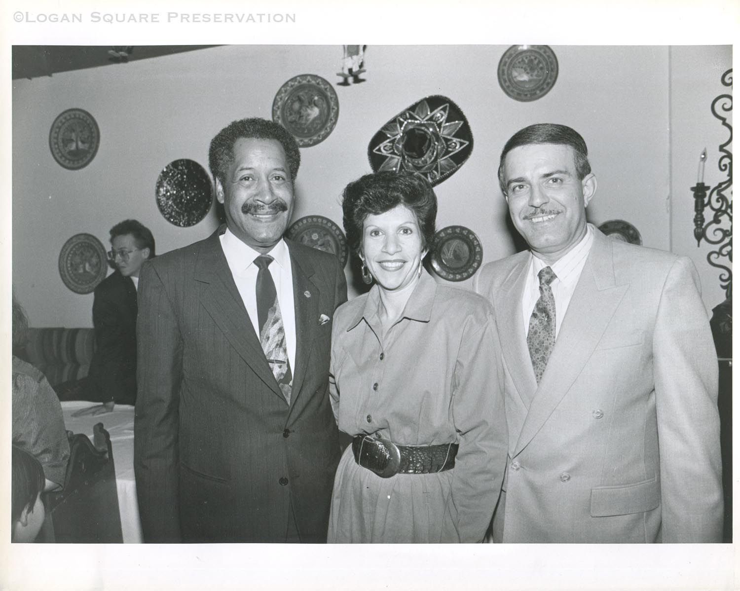 Group portrait of Mayor Eugene Sawyer standing with Tania's Restaurant owners Marta & Elias Sanchez, circa late 1980sPhotograph Details