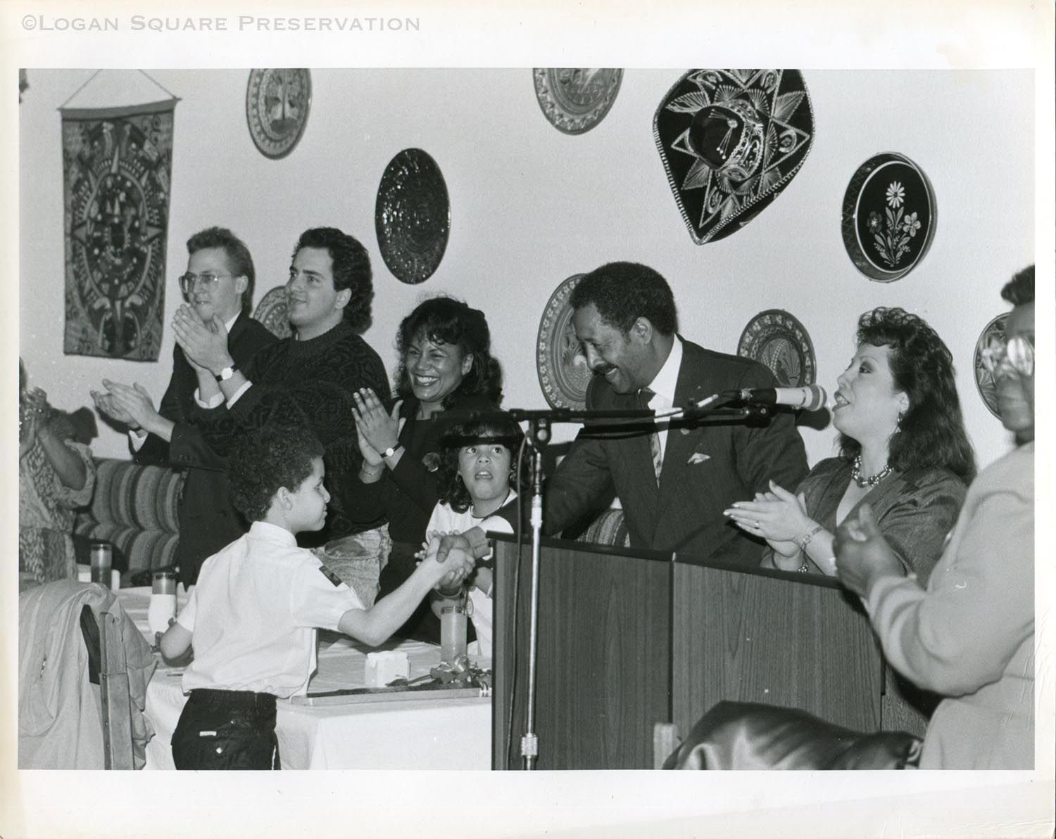 Photo of Mayor Eugene Sawyer shaking hands with young boy while onlookers applaud and woman speaks at lectern, circa late 1980sPhotograph Details