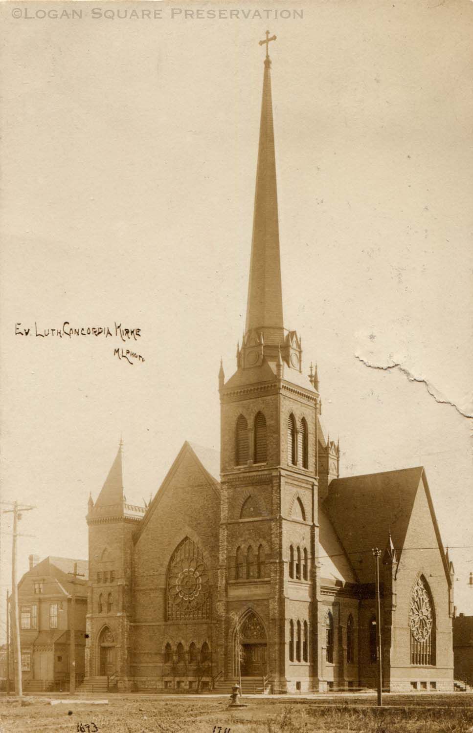 Real-photo postcard view looking southeast at brick Gothic church with tall steeple and no-longer-extant parsonage behind, sent by A. Wieghart of 3055 N Avers, Dec 16, 1912Subject Person/Organization