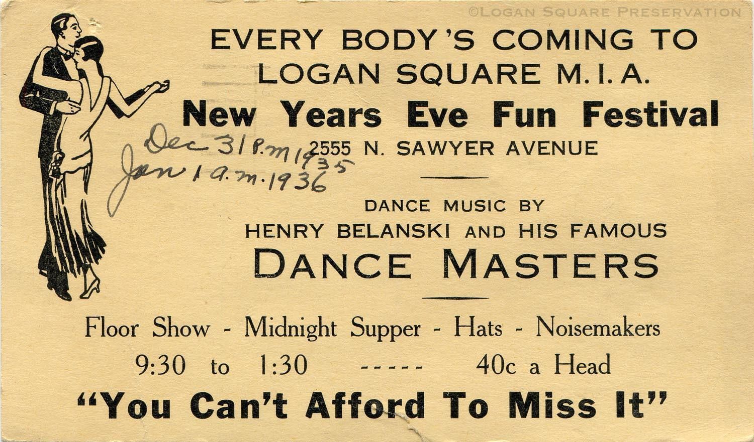 Postcard invitation to New Years Eve dance at Logan Square Ward L.D.S. church Mutual Improvement Association, 1935Subject Person/Organization