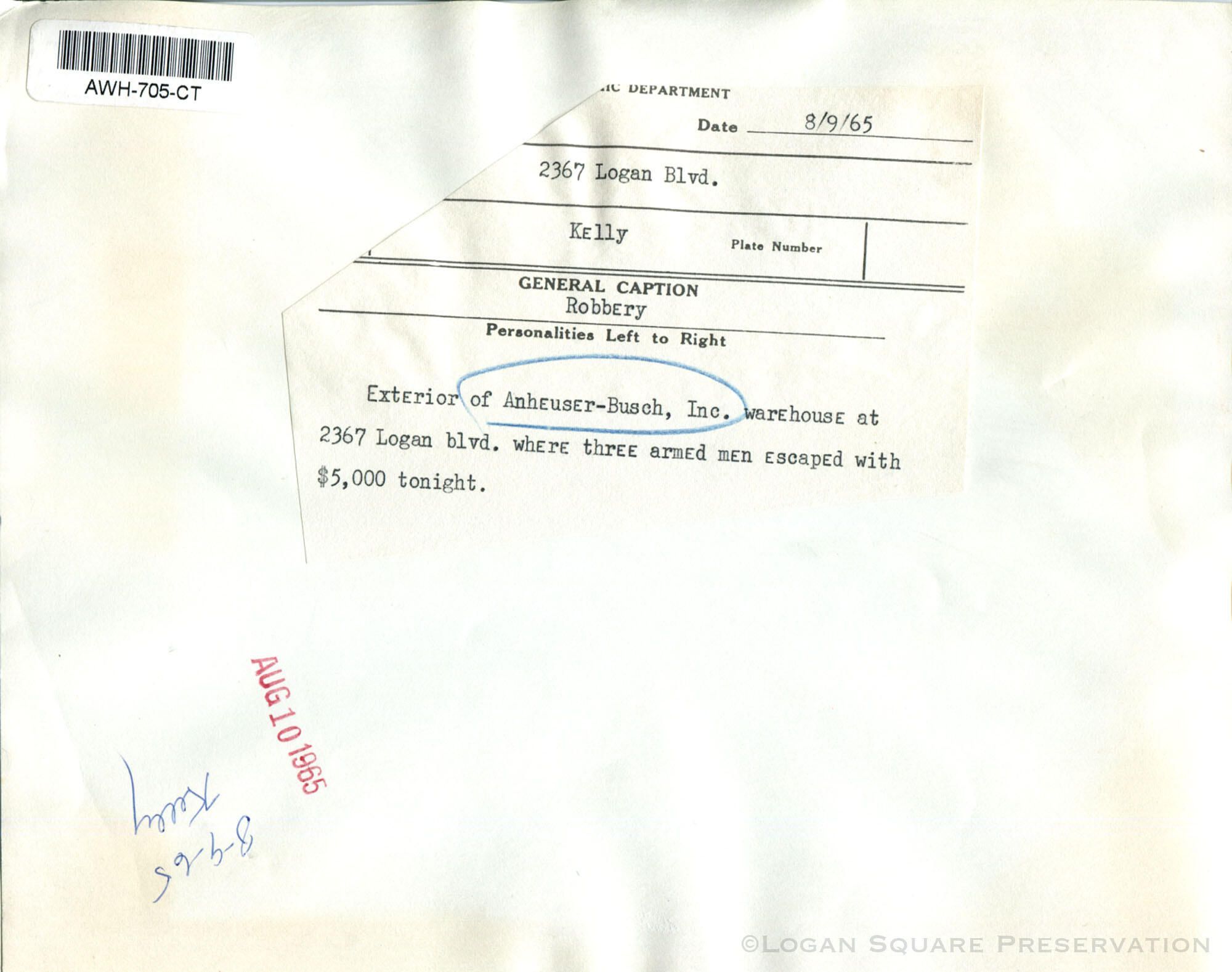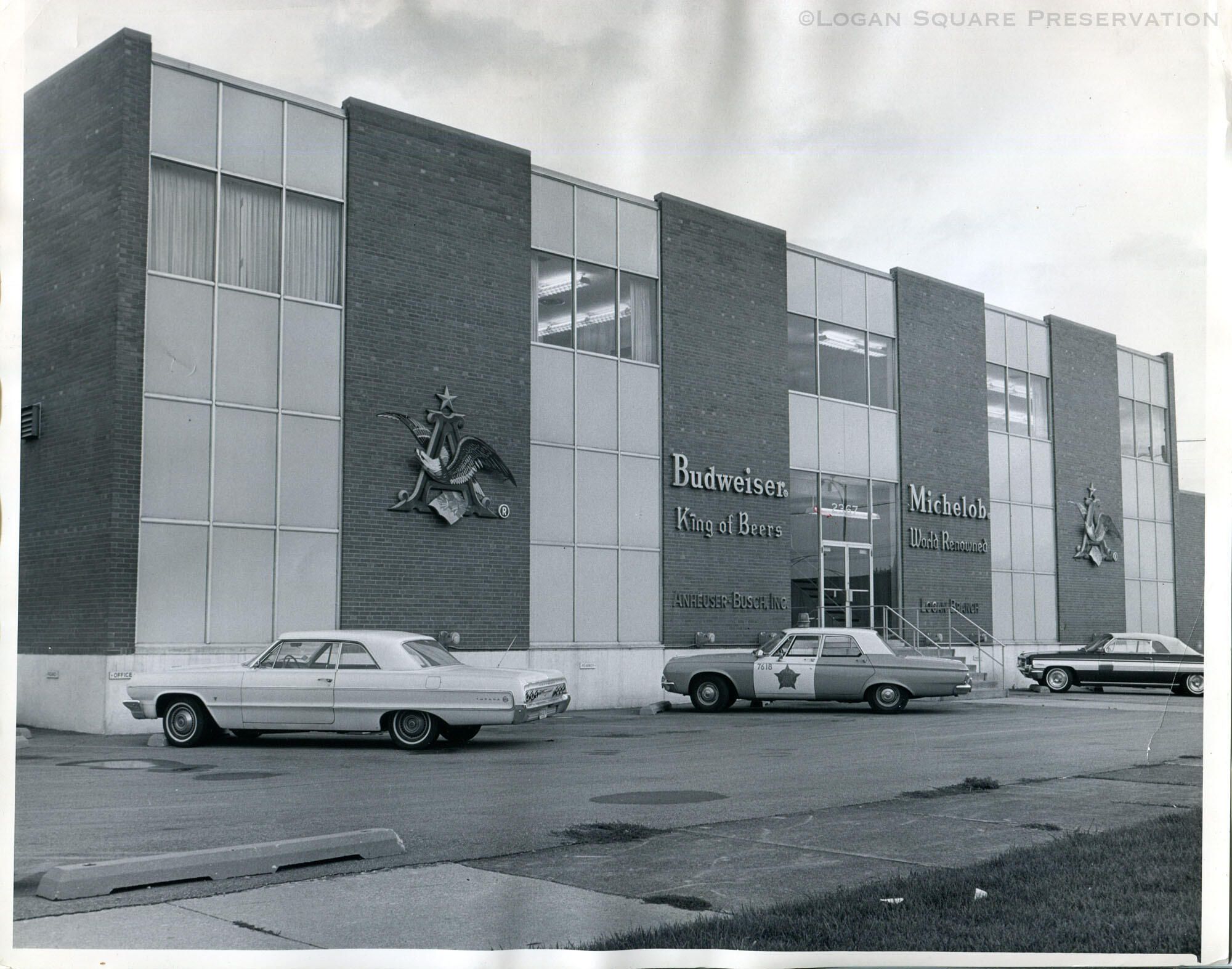 News photo view of exterior of Anheuser-Busch warehouse building with police car and other automobiles parked in front, site of robbery of $5,000 by three masked and armed men on Aug 9, 1965Photograph Details