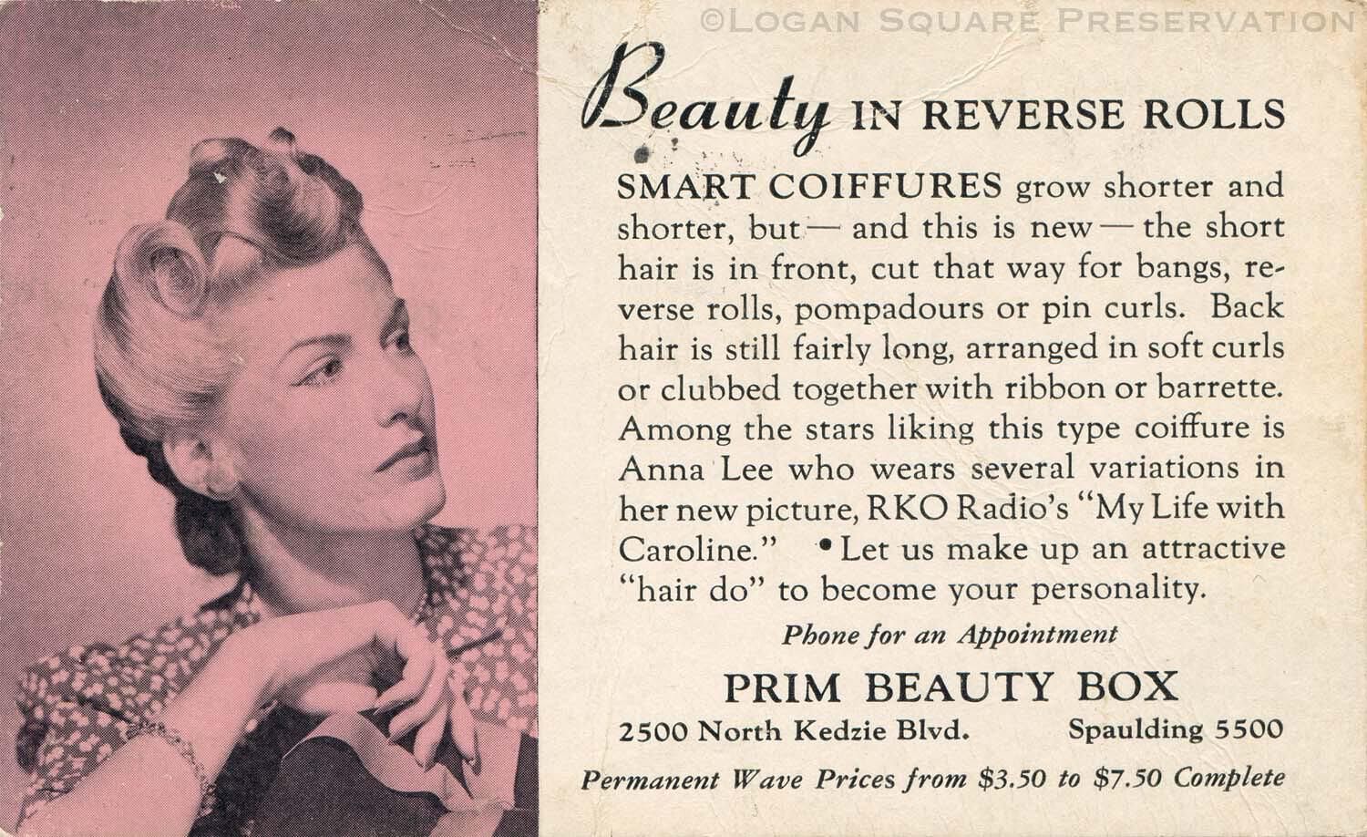 Promotional postcard with image of woman with permed hair sent by Prim Beauty Box to encourage Miss. C. Jarek to come in for a permanent wave before Memorial Day, 1941Subject Person/Organization