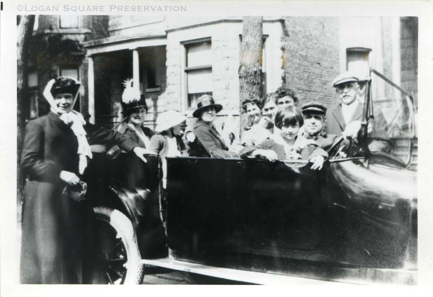 Reprint of snapshot photo of Felix & Palmira Fabbri family in open automobile parked in front of family home at 2525 N. Mozart, circa 1918Photograph Details